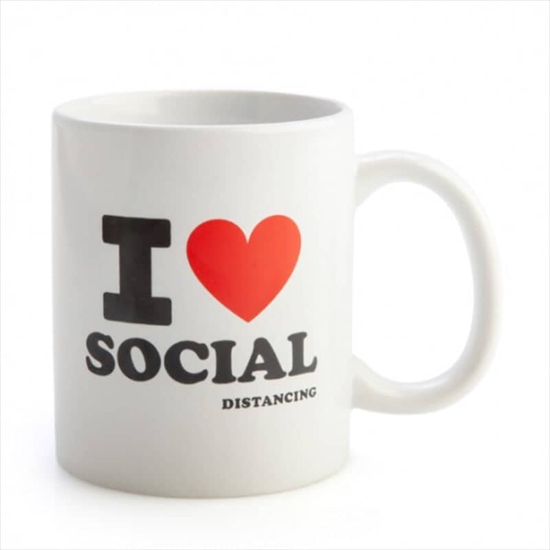 Quality white ceramic mug featuring bold I Heart Social (distancing) design