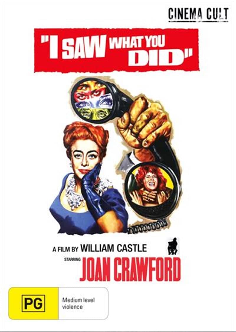 A prank phone call leads to a night of pure terror in director William Castle's I Saw What You Did, starring screen legend Joan Crawford. With her parents away on an overnight trip, Libby (Andi Garrett) amuses herself by joining her friend Kit (Sarah Lane) in calling up strangers and whispering , I saw what you did. When Libby dials Steve Marak (John Ireland), a pyschopath who just murdered his wife (Joyce Meadows), his jealous neighbour (Crawford) listens in on the call - a conversation that ends with the panicky killer determined to silence them all.