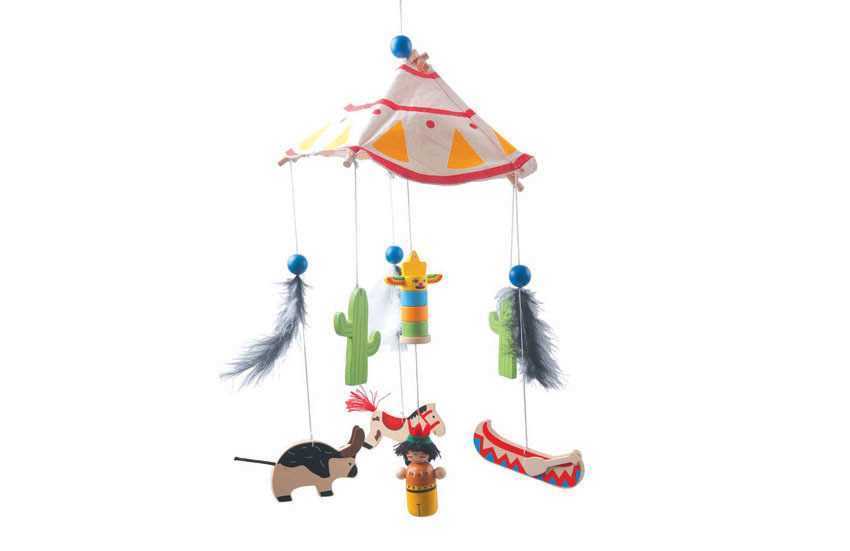 - Indian Mobile. This simple mobile will add character to any room. The mixed colours will compliment any decor. Each mobile is individually packed in a bright yellow box. 3 years plus. Size - 4 x 28 x 30 centimetres.