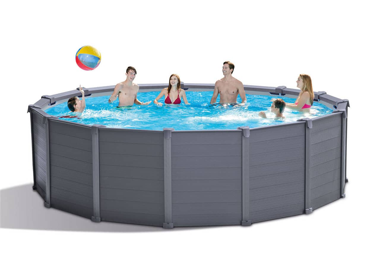 Swim in style all summer long with the Intex Graphite Gray Panel Pool 4.78m x 1.24m. This pool offers the look of upscale natural wood panels made of durable extruded plastic. Innovative new T-Joint design allows for simplified, quick and easy assembly. Hydro Aeration Technology™ is incorporated into the cartridge filter pump providing improved circulation and filtration, improved water clarity, and increased negative ions at the water surface.