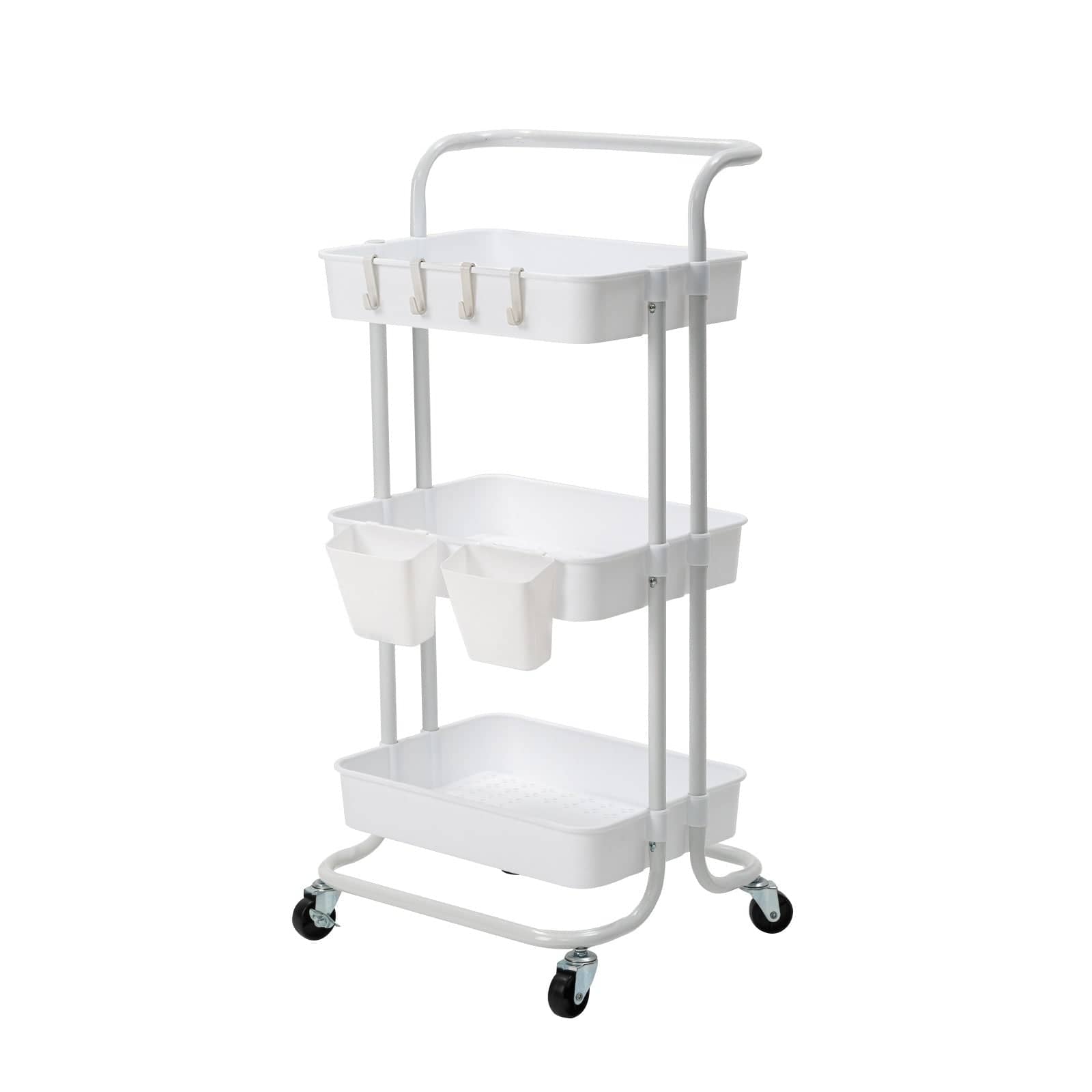 Spacious Storage Capacity: Equipped with removable hooks and hanging cups. Partition to store your various objects, neat and clear at a glance. This kitchen utility cart with wheels provides large storage space while saving you floor space to optimize the space utilization as much as possible; great storage solution for a kitchen, or use it for your pantry, office, garage, laundry supplies, toys, stationeries, or any other multitude of possibilities, etc.