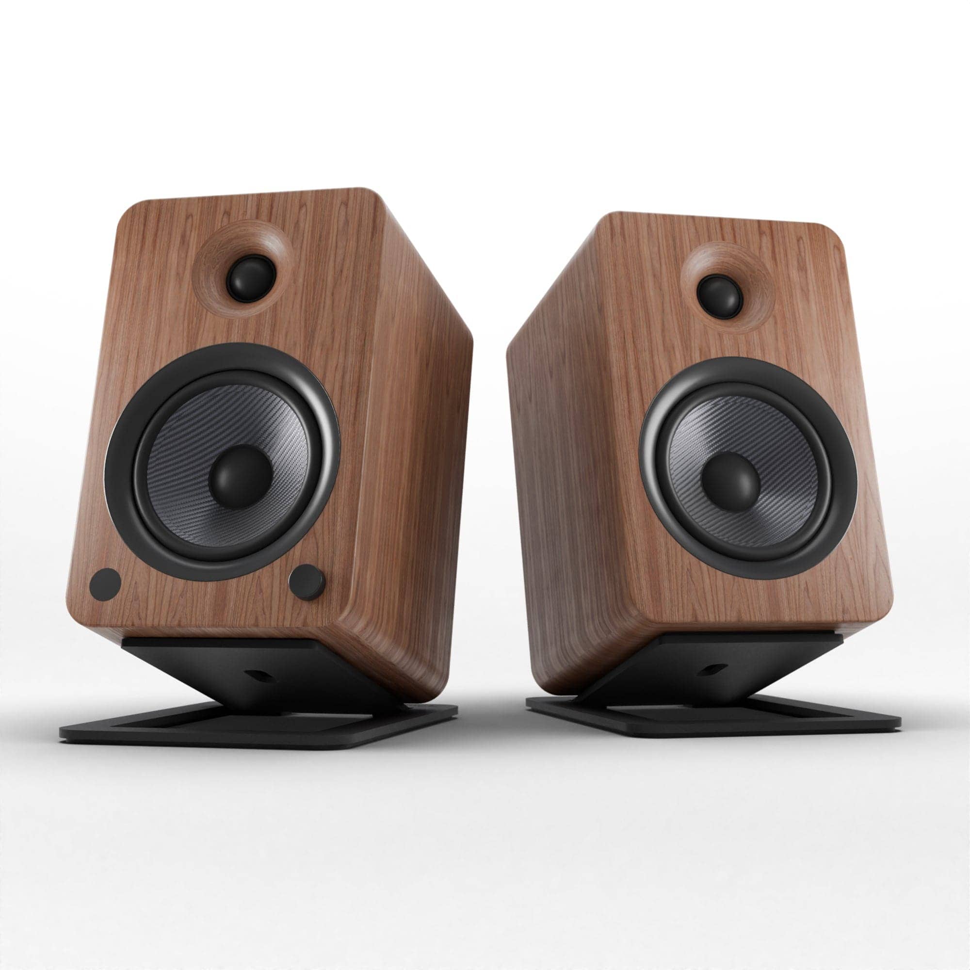 Experience unparalleled audio with the Kanto YU6 200W Powered Bookshelf Speakers in Walnut. These speakers redefine loudness with their formidable Class D amplifier, delivering 200W peak power. Featuring 5.25” Kevlar® drivers and 1” silk dome tweeters, the YU6 fills every inch of your living space with detailed sound, leaving you grinning from ear to ear. With a built-in phono preamp and Bluetooth® connectivity, spinning your favorite tunes is effortless. Bundled with the Kanto S6 Angled Desktop Speaker Stands, these stands ensure optimal speaker placement on your desktop, providing a 16° tilt for enhanced sound projection. With foam padding to reduce vibration, they securely hold your YU6 speakers in place for an immersive audio experience.