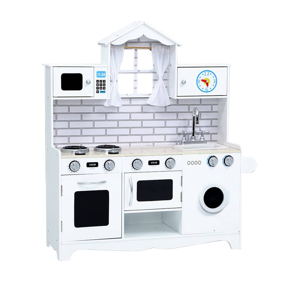 Our delightful kitchen set features an impressive decorative look with a cute little window and clock and comes with complete kitchenware and appliances. It is well-equipped with a large microwave, a tap and detachable sink for washing and rinsing items and turnable knobs for a real-like experience. Additionally, it has ample storage space to keep everything in place. It is quite sturdy and will last long. Not least, this playful kitchen set is free from harmful chemicals and completely safe for your kids as well as it is EN71 European Safety of Toys certified.