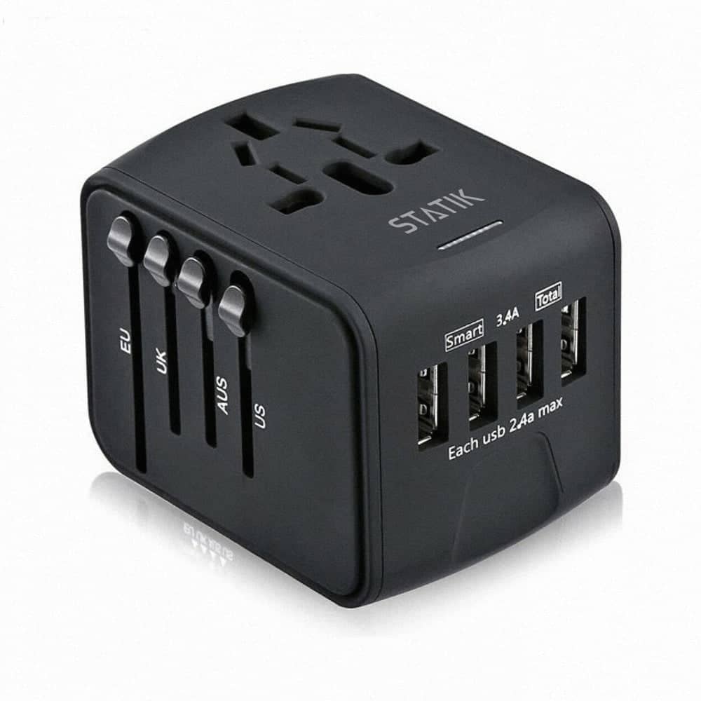 KeySmart STATIK GloboCharge Lite Power Adapter-12W - Black. Charge Devices in 200 Countries: Go farther and travel more with one simple adapter. Works in the US, Europe, Australia, and the UK. The sliding adaptive plug lets you easily charge up in over 200 countries with just one GloboCharge Lite. Charge 5 Devices at Once. Features 4 USB-A Ports for charging your phone and daily devices like earbuds and fitness trackers, plus 1 Universal Outlet for laptops and larger electronics. Fast-charging enabled with one device at a time. Baby-Safe Design: The tamper-resistant universal outlet features spring-loaded safety shutters help to prevent small children from electrical shock. Protects Your Devices from Damage. Built-in safety features like overcharge protection and surge protection keep your phone safe while you travel. Not a Voltage Converter: Not recommended for large devices or appliances. Do not use with hairdryers, curling irons, or straighteners. 1-year warranty. You're protected by our 1-year warranty and premium quality guarantee.