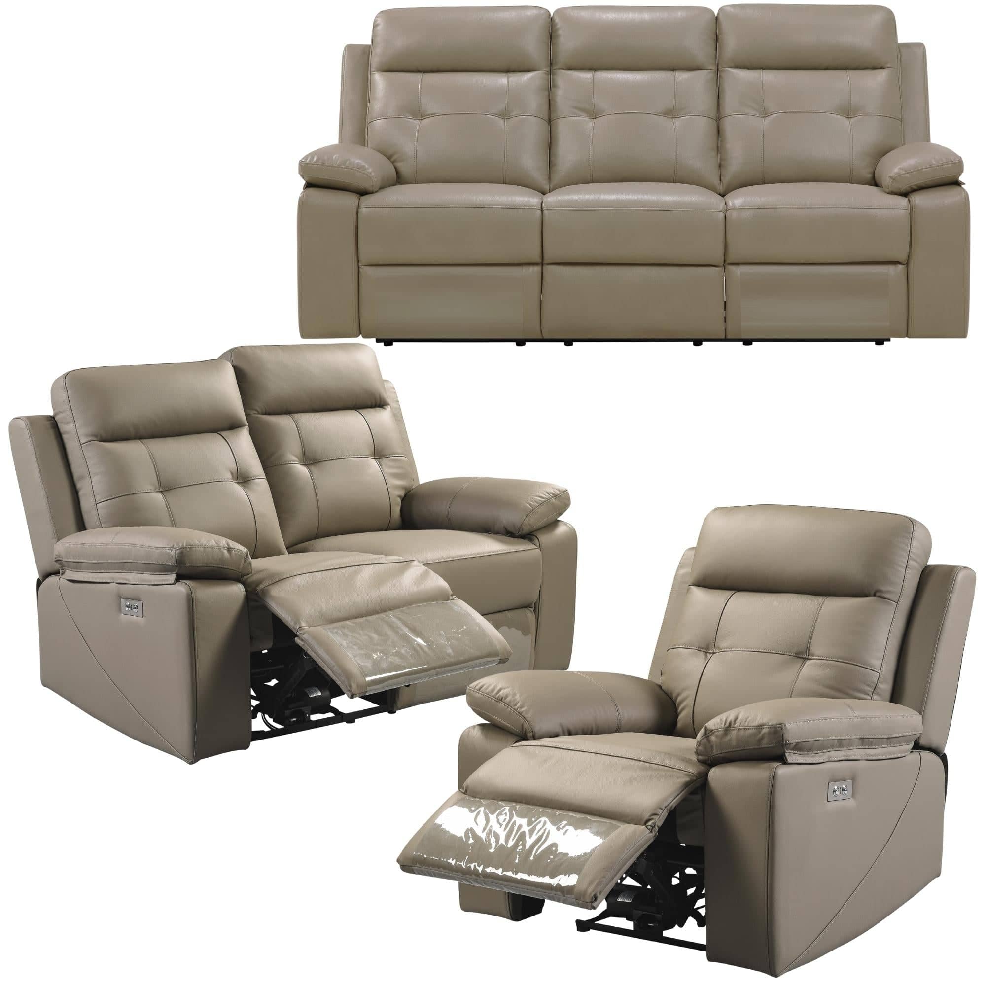 This is a super-luxurious lounge suite with electric recliner action. Bring it into your home to experience the best living room comfort. The beautiful set of 3-seater, 2-seater, and single-seater lounges, in latte colour, beautifies your living area readily. Designed in a modern style, the lounge set consists of a highly efficient recliner and a USB charging port. The lounges have thick, padded arms and lumbar support for added luxury and comfort. The recliner mechanism can easily withstand weights of up to 120 kg. Fully upholstered in top-quality Buffalo leather, the lounges look gorgeous amid any interior decor setting or room theme. Their structural frame is made of sustainably harvested plywood and solid wood, with a seating support that consists of dense foam, webbing, and pocket springs. With such high-performance material, the lounges become strong and durable. The frame has a five-year warranty; the foam and springs have a three-year warranty; the leather and stitching have a one-year warranty; the recliner mechanism and electric parts have a one-year warranty; and all other parts have a one-year warranty. They are just perfect for living areas, game rooms, family rooms, children's rooms, guest rooms, entertainment rooms, home theatre areas, and offices.