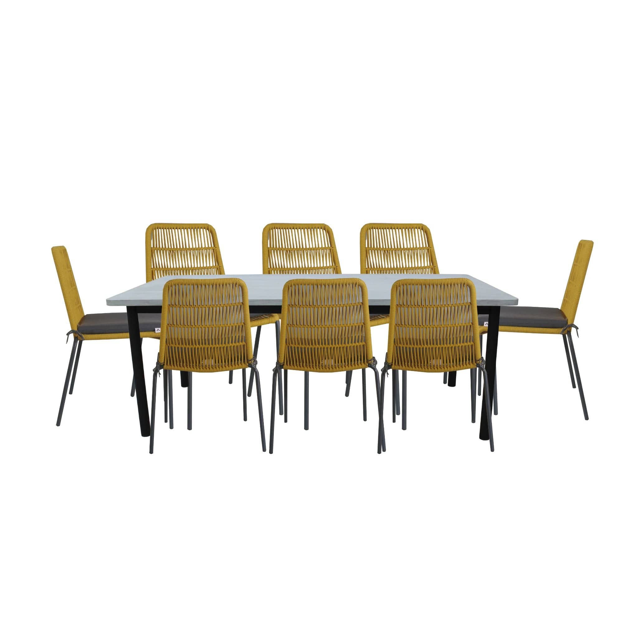This eye-catching 8-seater dining table set is designed especially for outdoor spaces. Designed in a Hampton style, the table is weather-proof, water-repellent, stain-resistant, and UV-protected. It has concrete tabletop in sandy white finish and aluminium powder coated base in charcoal. The table looks good with yellow rope chairs. The chairs are designed in the Scandinavian style, and they are conveniently stackable. They come with comfortable seat cushions with polyester upholstery and strong iron legs that perform well in outdoor spaces. Waterproof plastic rope placed nicely on the back and seat of the chair further enhances its looks. A structural frame made of steel, powder coated with an ED coating, gives it great robustness. The yellow chairs with charcoal colour legs look stunning in all decor settings. 1-year warranty.