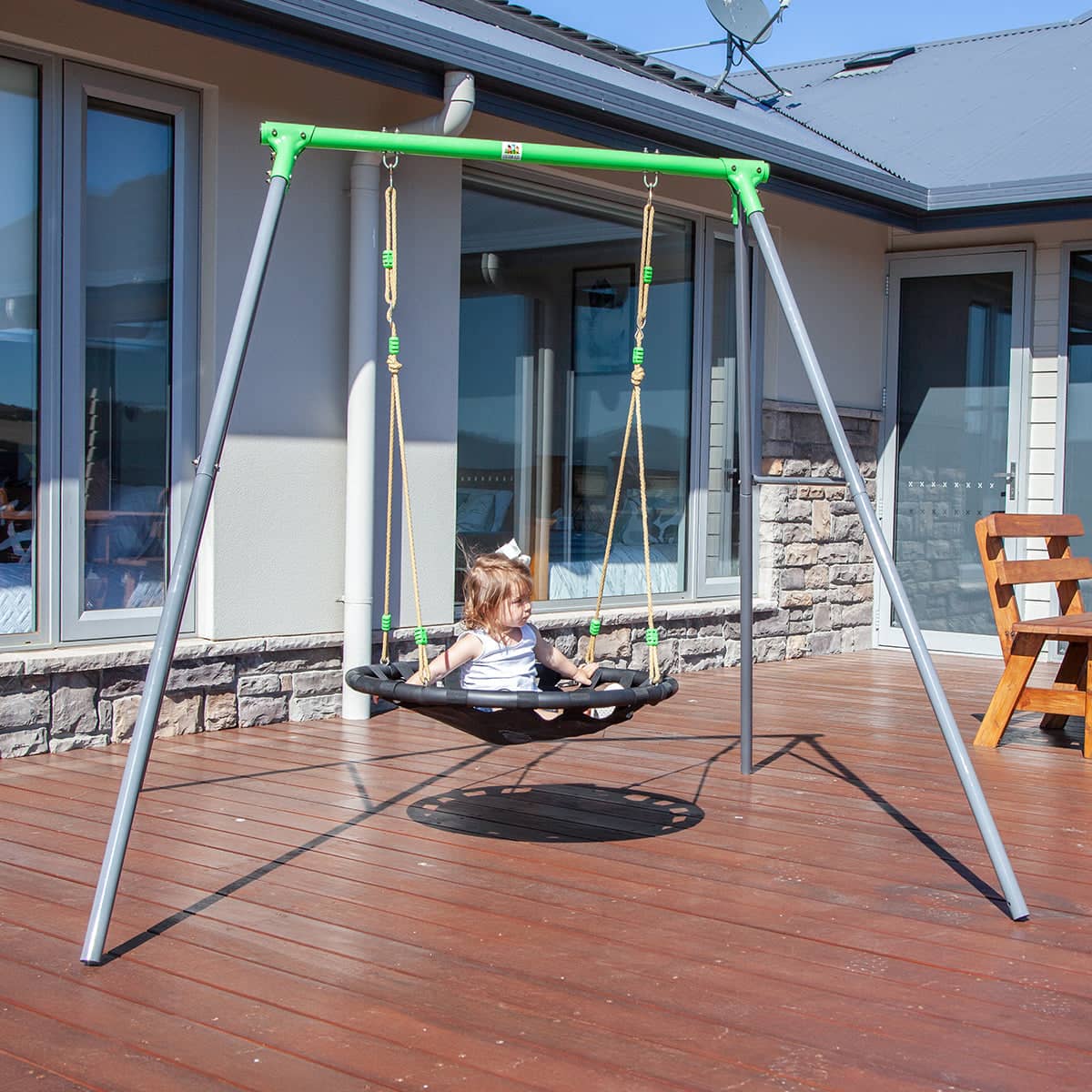The Cellar metal swing set, with its nest swing can be as relaxing as a hammock gently swaying in the breeze, but it can also take little thrill seekers on high flying adventures. Watch them soar through the sky on a magic ride or glide at their own speed.