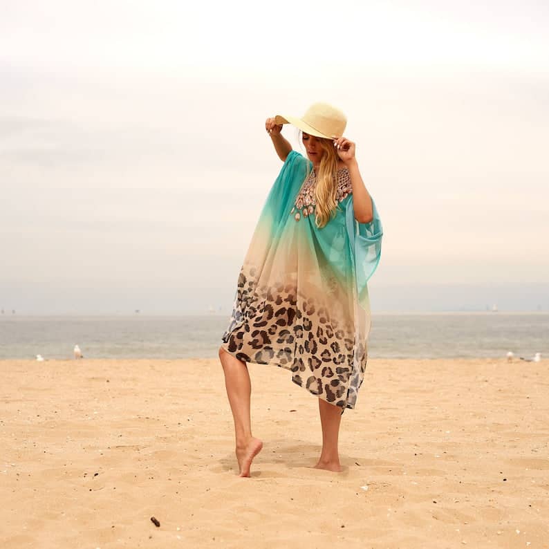 Linen Connections Trendy Silk Kaftan For Women Long Caftan Resort Wear Vacation Beach Dress Boho Silk Dress Kaftan Necklace Print Silk Kaftan Gift For Her | Ultramarine Green