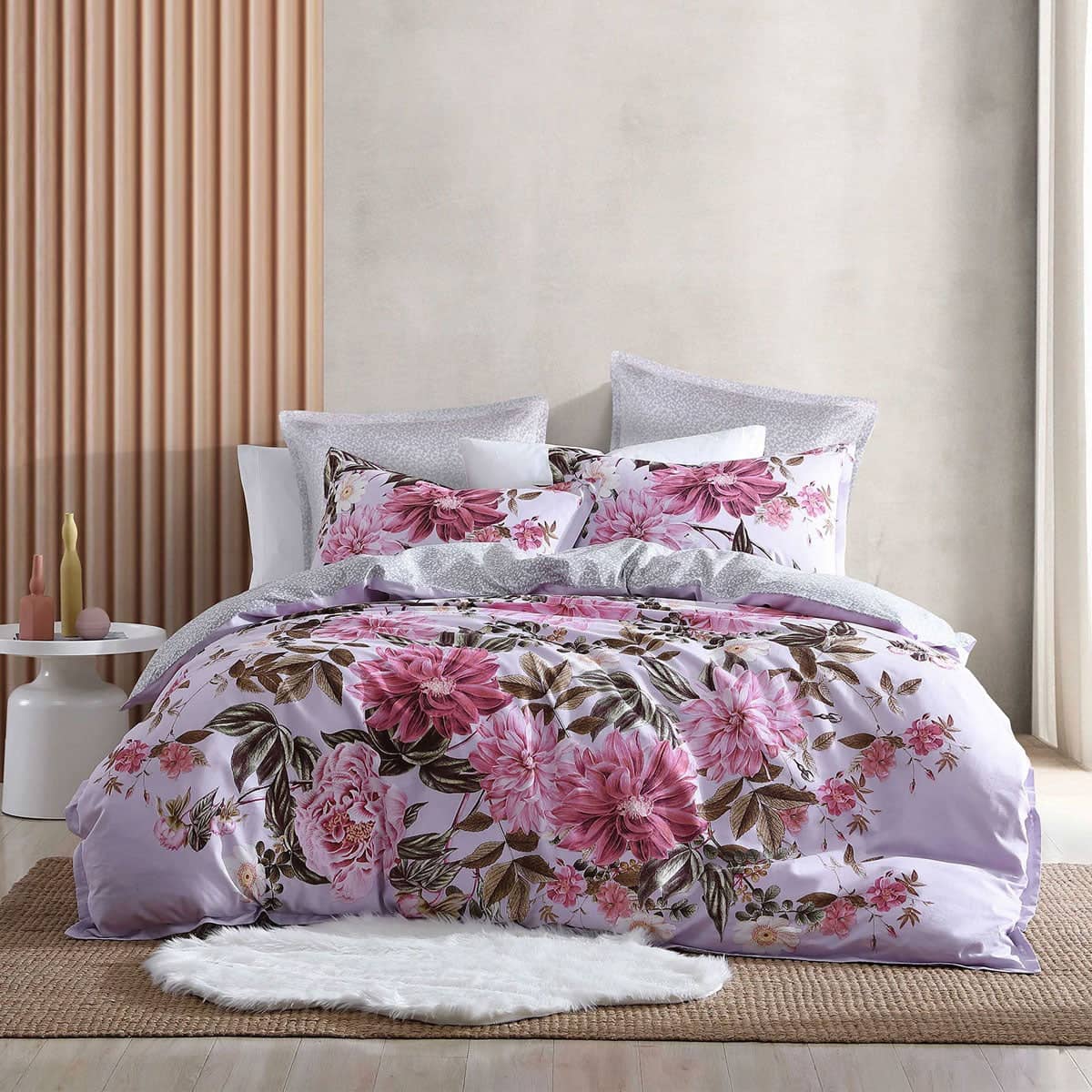 Wrap yourself in blooming Winter florals for a beautiful nights rest with the Maeve Lilac Cotton-rich Percale Print Quilt Cover Set by Logan and Mason. Featuring a large scale floral bouquet in lilac, white, olive, cream, pink, purple, and green hues on a soft, dreamy lilac ground, Maeve reverses to delicate floral print for maximum contrast.