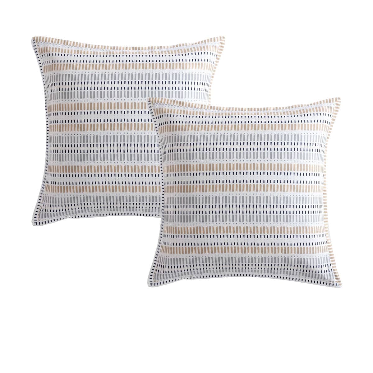 Introduce a bold use of pattern to your bedroom with Statham Navy 250TC 100% Cotton Sateen Quilt Cover Set by Logan and Mason, a contemporary geometric. Over scaled shapes with stripes, stitch like details and markings to form a textural and balanced composition. In shades of navy, taupe, teal, and white, a more masculine appeal has been achieved. To complete the design, twisted cord in the autumnal hue - caramel has been used. Enhance the overall appearance with the coordinating European pillowcases available for an additional cost.