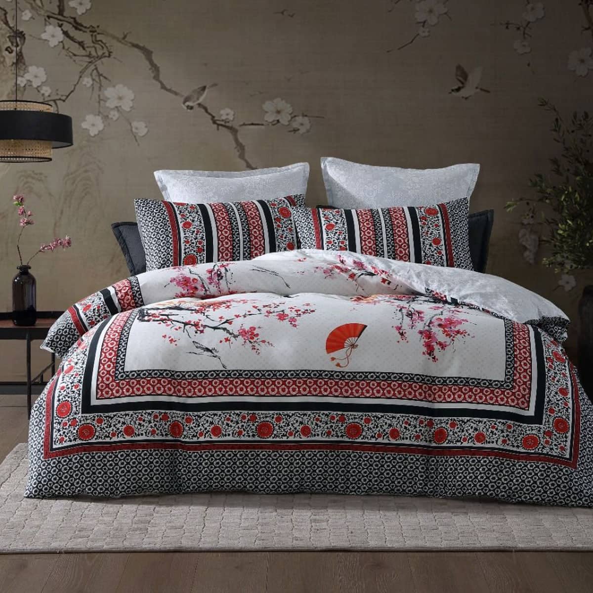 Drift off to sleep among cherry blossoms and whimsical oriental fans with Tokyo Drift Red 250TC 100% Cotton Sateen Quilt Cover Set by Logan and Mason. A bold border print of oriental themed pattern frames this design in red, taupe, black, white, pink, yellow, brown, and grey colour hues. A soft oriental tonal reverse compliment the front statement piece with black corded piping. Enhance the overall appearance with the coordinating European pillowcases available for an additional cost.
