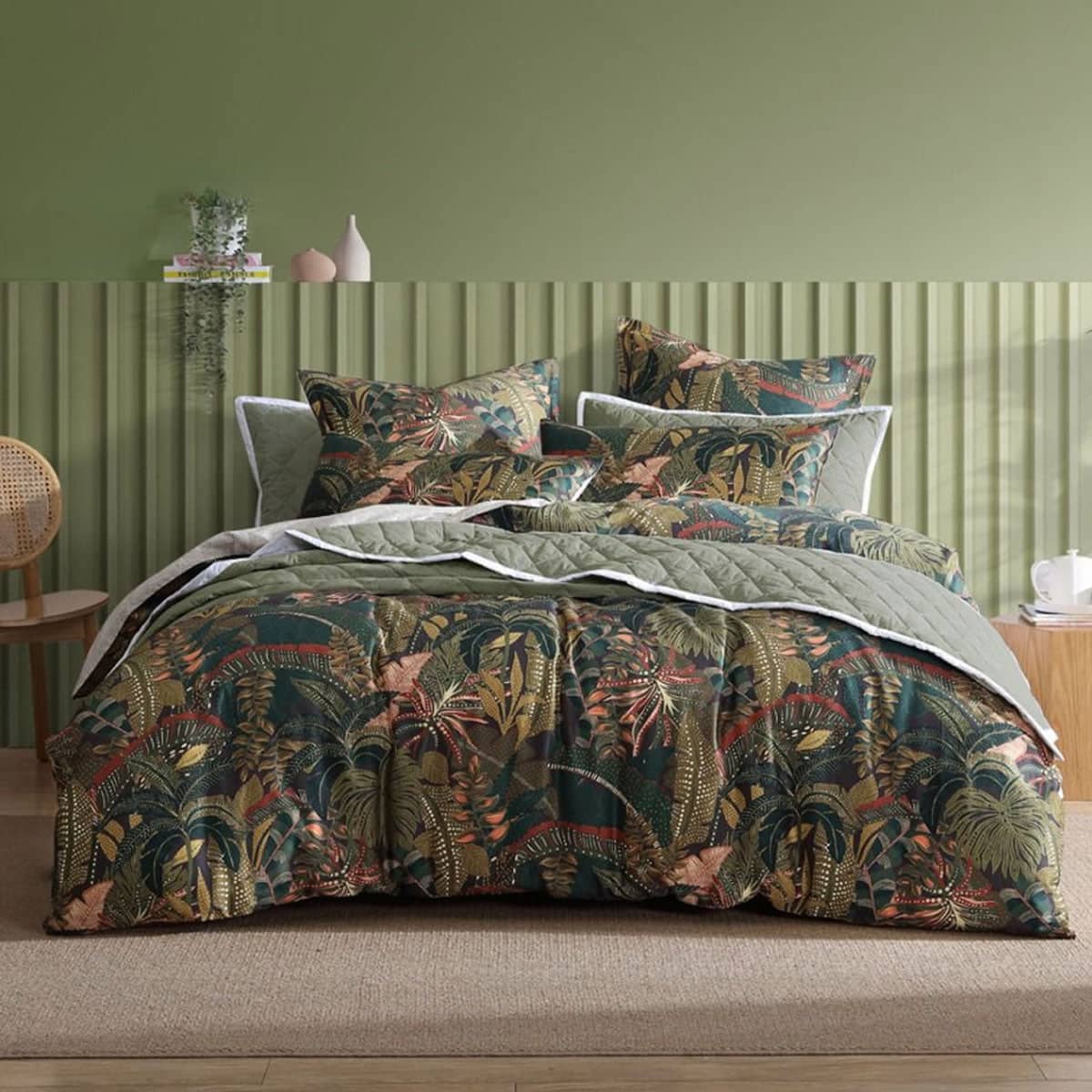 Zawadi Green 250TC 100% Cotton Sateen Quilt Cover Set by Logan and Mason reflects the everlasting tropical theme suited to the Australian style. Its dense foliage pops against the green, cream, brown, pink, charcoal, and olive colour hues, and the naive art form with tribal elements create a modern whimsical feel. Zawadi has a reverse with a stylized leaf in a geometric pattern. Enhance the overall appearance with the coordinating European pillowcases available for an additional cost.