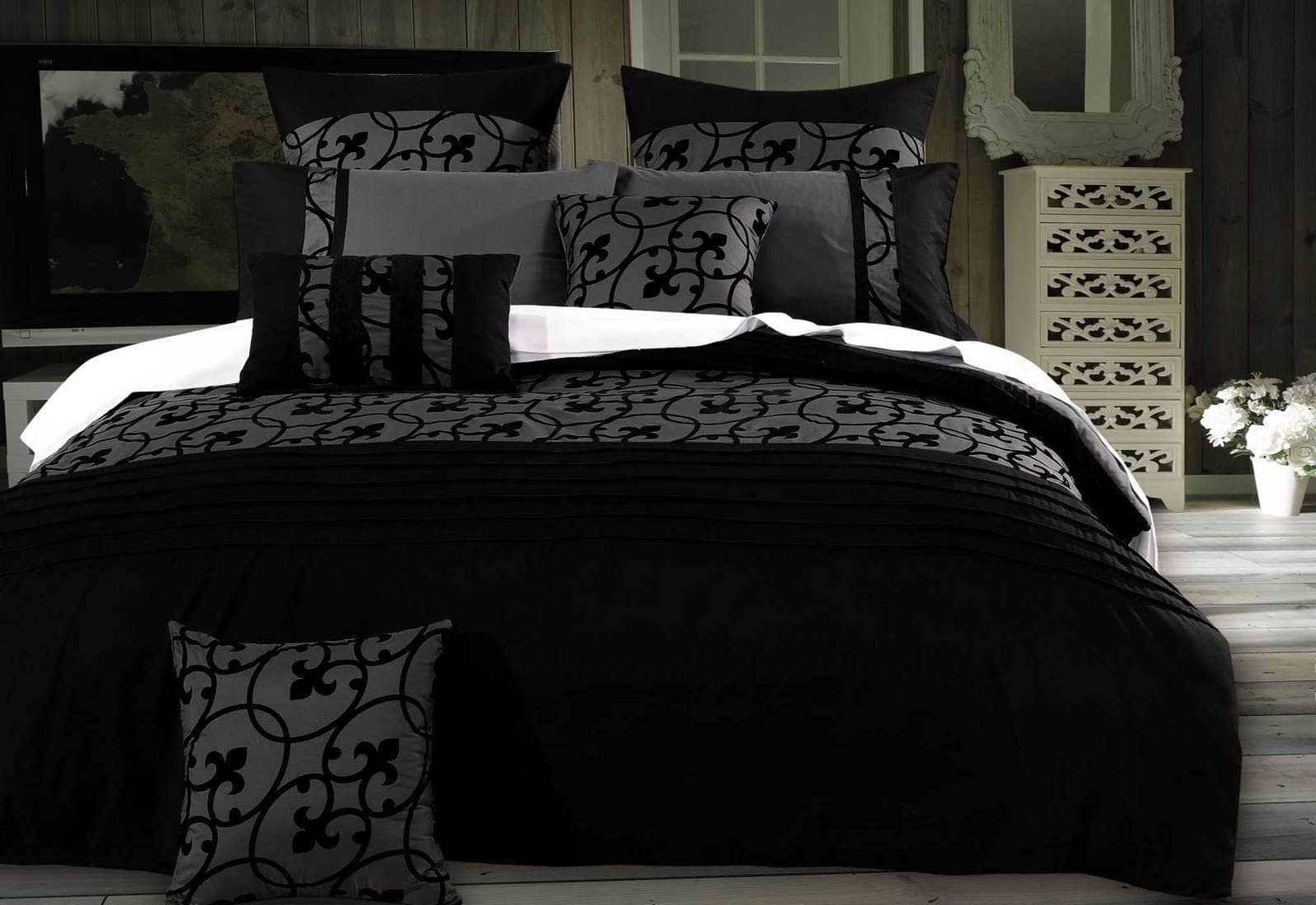 Luxton Super King Size Charcoal Black Flocking Quilt Cover Set(3PCS)