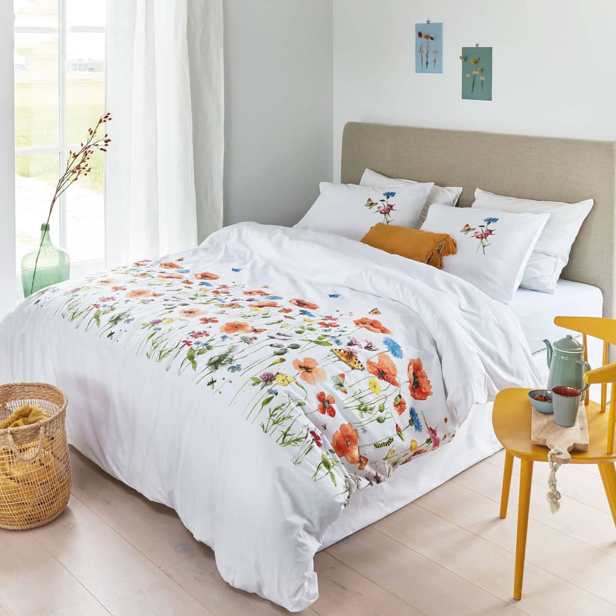 The Poppy Parade Multi Cotton Quilt Cover Set by Marjolein Bastin is the perfect addition to a spring interior. The print features a central band of grasses and flowers, including poppies and buttercups printed in cream, white, green, brown, yellow, blue, red, black, grey, and pink colour tones, against a white background. Butterflies flit among the flowers. The pillowcases are white with a small flower and butterfly in the top right corner. The quilt cover is made of 100% cotton.