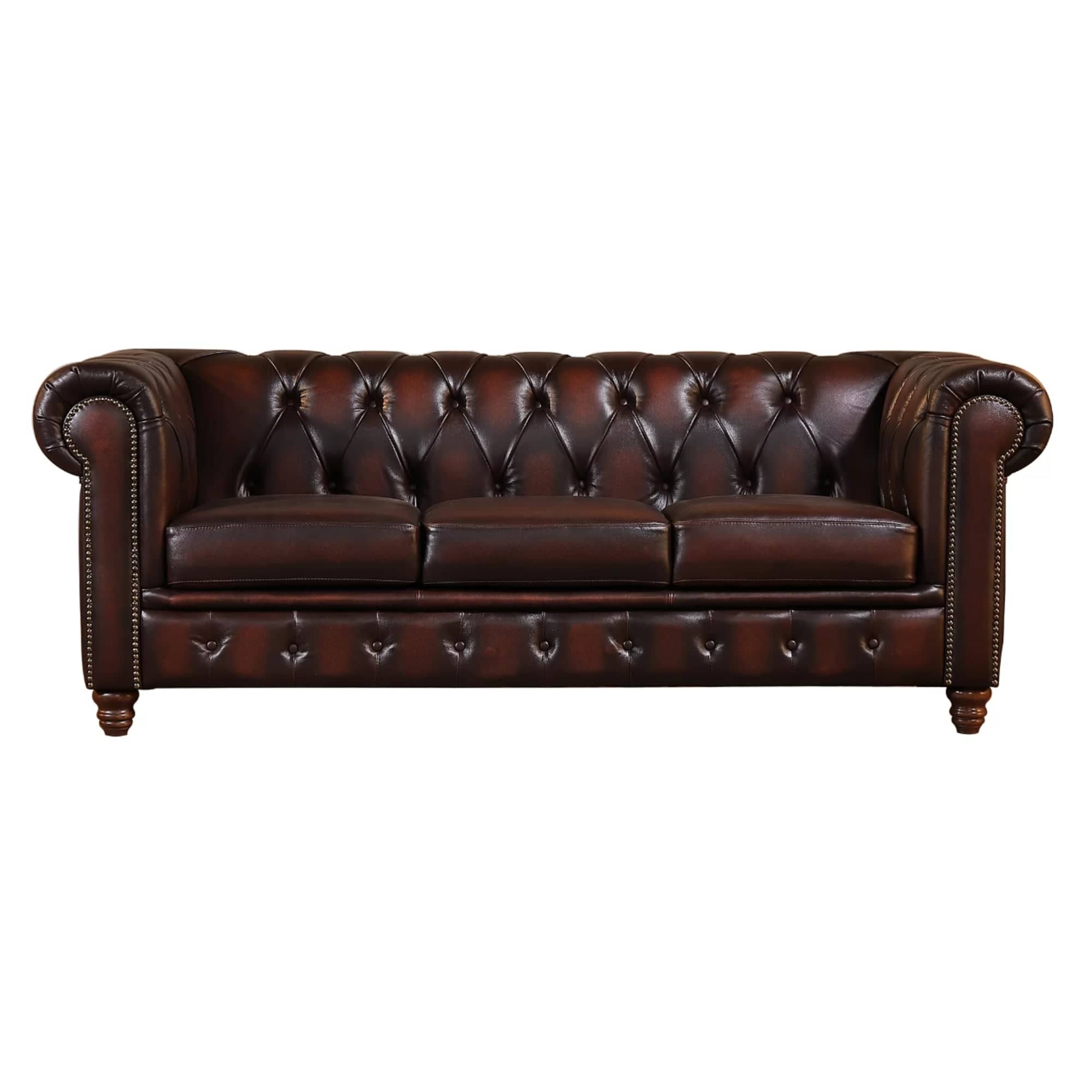 This 3-seater sofa in Antique brown creates a cosy space in your living area. The sofa, designed in a classic chesterfield style features button tufting, rolled arms and stud details. It beautifies any interior decor style due to its colour and evergreen design. Upholstered in top grain full leather, the sofa gives a nice look. Its structural frame is made of sustainably harvested Malaysian Hardwood, a sturdy solid wood. The high-density foam and zig-zag springs ensure the best seating support. Solid wood legs in dark walnut colour give it a strong base. The sofa is durable as well. One-year warranty.