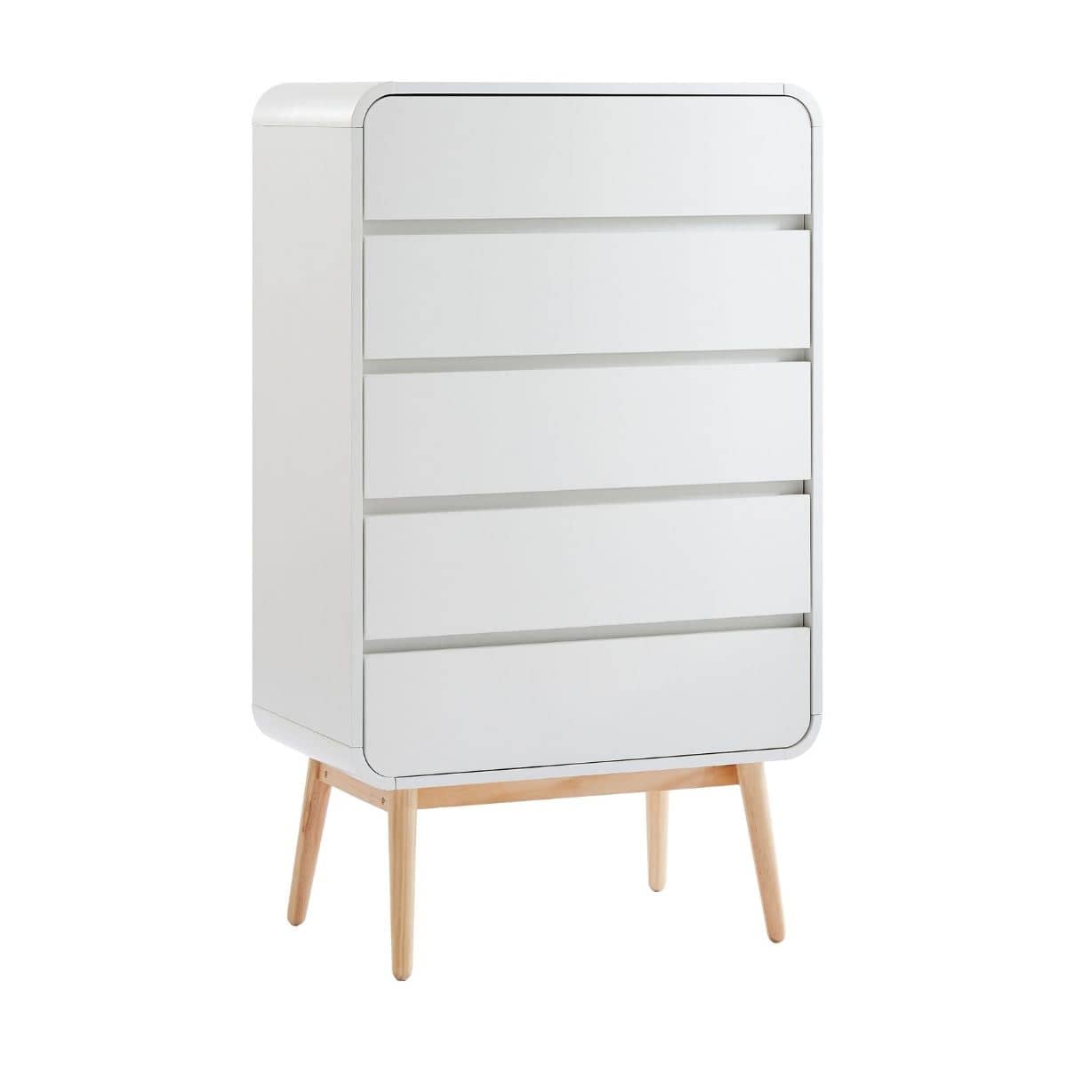 Your storage options just got a lot more style! Featuring a crisp and sleek silhouette and a curved edge, the Chest of Drawers instantly transforms your space into a style haven. Our drawers don- need handles - just give it a push to open! Built with 100% natural pine wood and excellent craftsmanship, you can expect a sturdy and durable companion that will last.