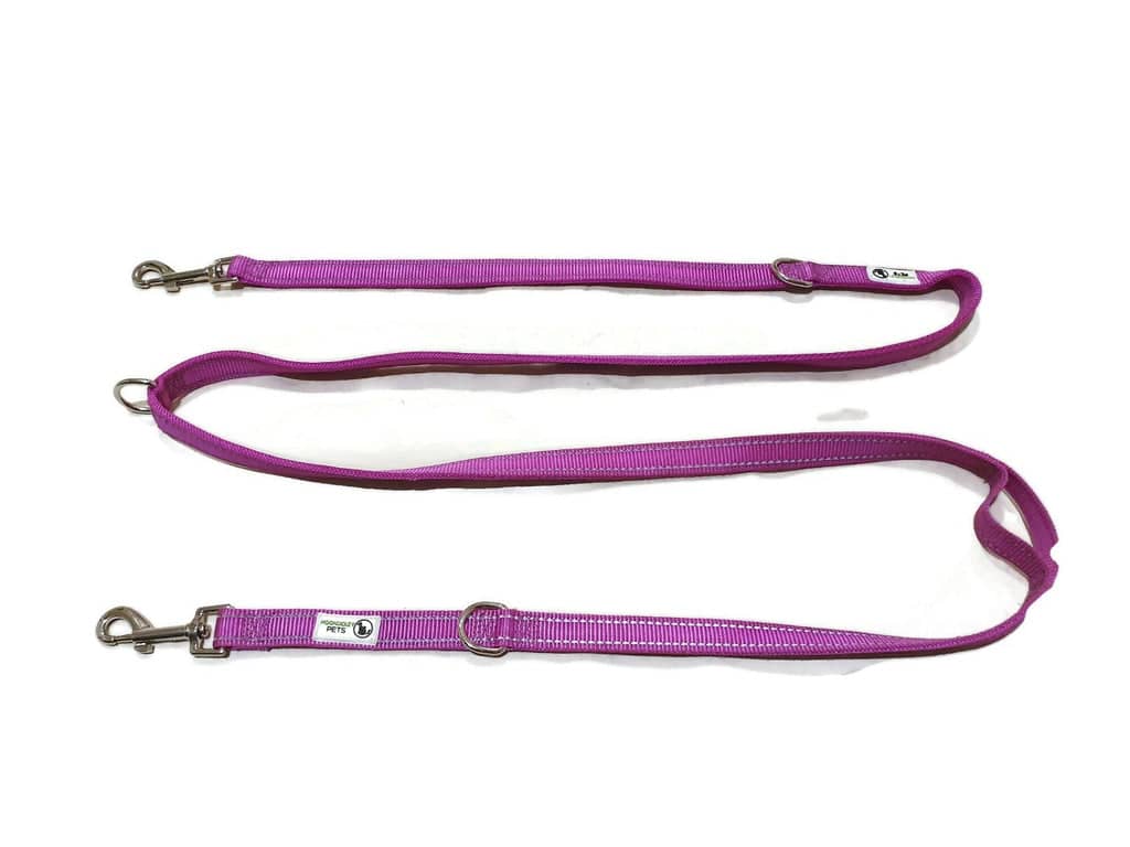 Multi Dog Lead - Nylon w/Reflective Stitching - Double Clip ,Coupler, Waist Belt, Short/Long, Quicktie 20mm Purple