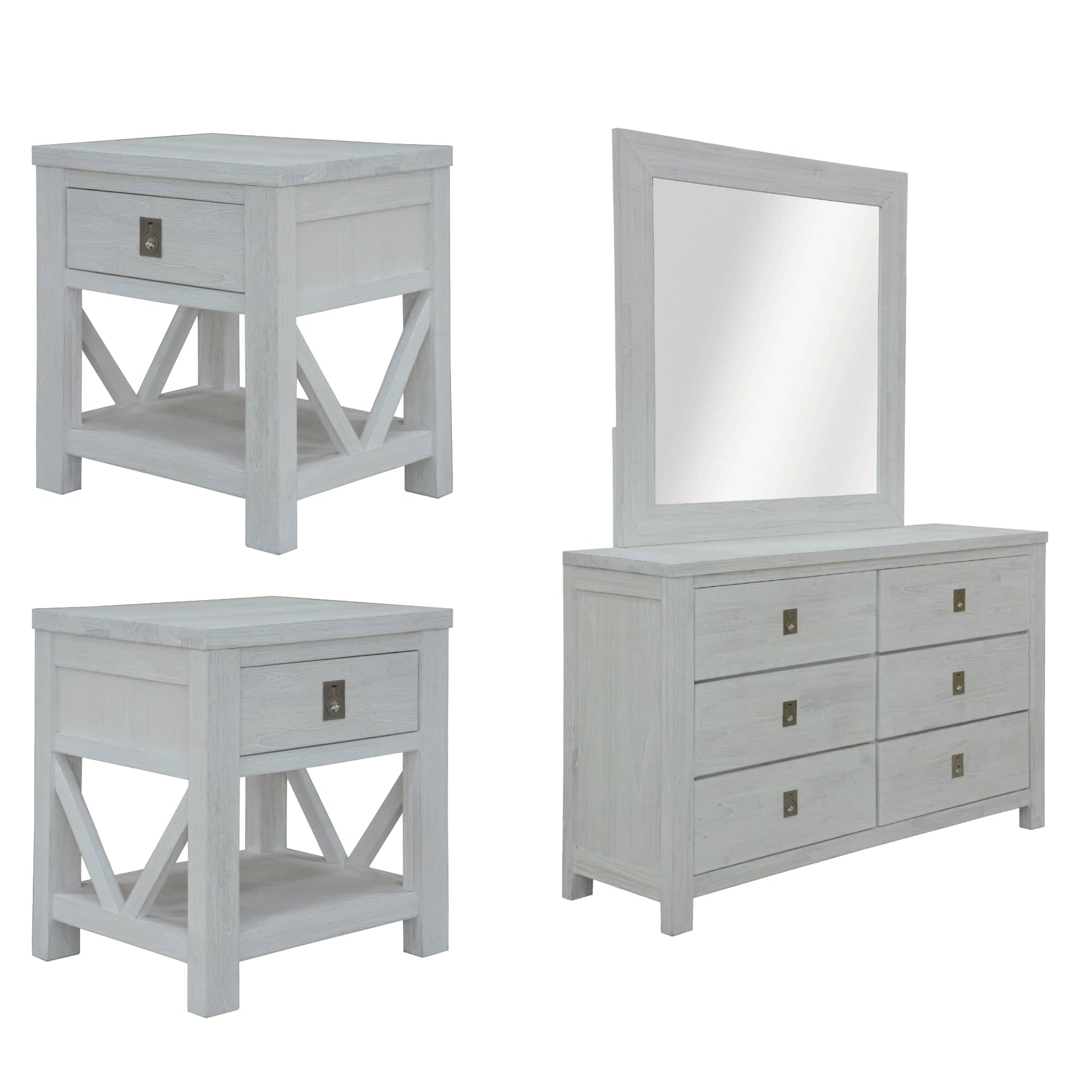 This amazing dresser-mirror-bedside set is crafted in a coastal style. The dresser has 6 drawers and bedside has 1 drawer and a shelf. A V-shaped pattern makes the bedside look beautiful. All the drawers have full metal extension runner and textured metal handle in silver colour. An equally beautiful, annealed glass mirror in a wooden frame makes the dresser even more useful. The furniture set is made of sustainably harvested solid Mindi wood. The wood is known for its amazing strength, durability, shock-resistance, and ease of maintenance. The set in a white-washed finish goes well with a variety of interior decor styles, and a one-year warranty is included with the easy-to-assemble set. Individual pieces are fully assembled.