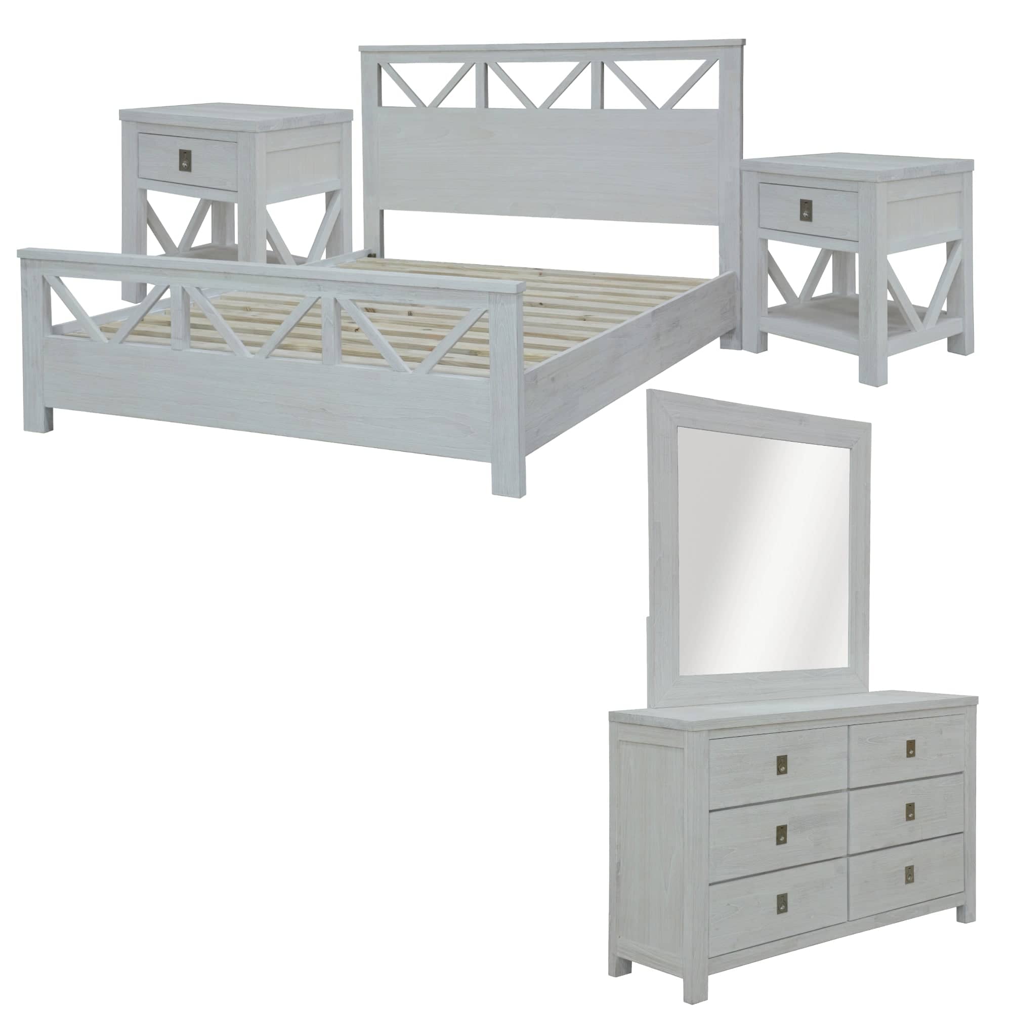 This double bed, dresser-mirror suite is crafted in a coastal style. The suite consists of 1pc double bed; 1pc dresser with 6 drawers; 1pc annealed glass mirror in a wooden frame and 2pcs bedside tables with 1 drawer and shelf each. All the drawers have full metal extension runners and textured metal handles in silver colour; V-shaped pattern in the bedside. A distinctive headboard and footboard with V-shaped pattern gives a sophisticated look to the bed. Further, a solid wood slat system with central support legs gives the bed great robustness. The entire furniture set is made of sustainably harvested solid Mindi wood. The wood is known for its amazing strength, durability, shock-resistance, and ease of maintenance. The suite in a white-washed finish goes well with a variety of interior decor styles, and a one-year warranty is included with the bed frame. The best part is that only the bed needs to be assembled in the entire suite.