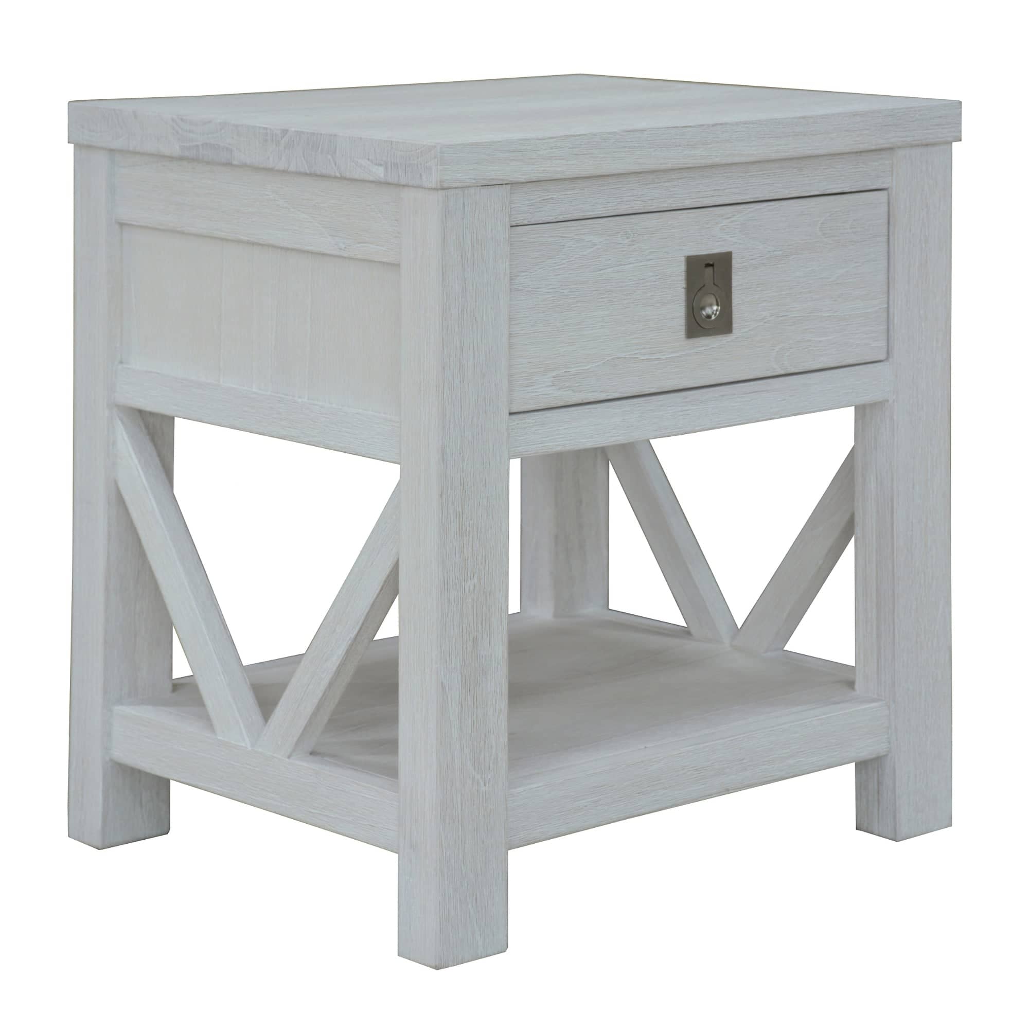 This bedside is crafted in a coastal style. The bedside table has 1 drawer and shelf. The drawer has full metal extension runner and textured metal handle in silver colour; V-shaped pattern in the bedside makes it look attractive. The furniture is made of sustainably harvested solid Mindi wood. The wood is known for its amazing strength, durability, shock-resistance, and ease of maintenance. The bedside in a white-washed finish goes well with a variety of interior decor styles, and a one-year warranty is included with the fully assembled furniture piece.