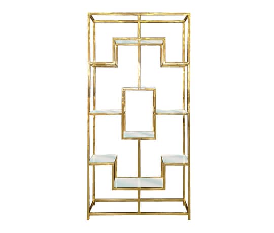 Nelson Bookcase / Shelving unit that comes in a stunning gold color. The dimensions of the product are 100cm x 200cm x 29cm, making it a great size for any room in your home. The bookcase is made of high-quality stainless steel and glass materials, ensuring durability and longevity. It's perfect for organizing your books, displaying your favorite decor items, and adding a touch of elegance to your living space. Upgrade your home decor with this beautiful Nelson Bookcase / Shelving unit.