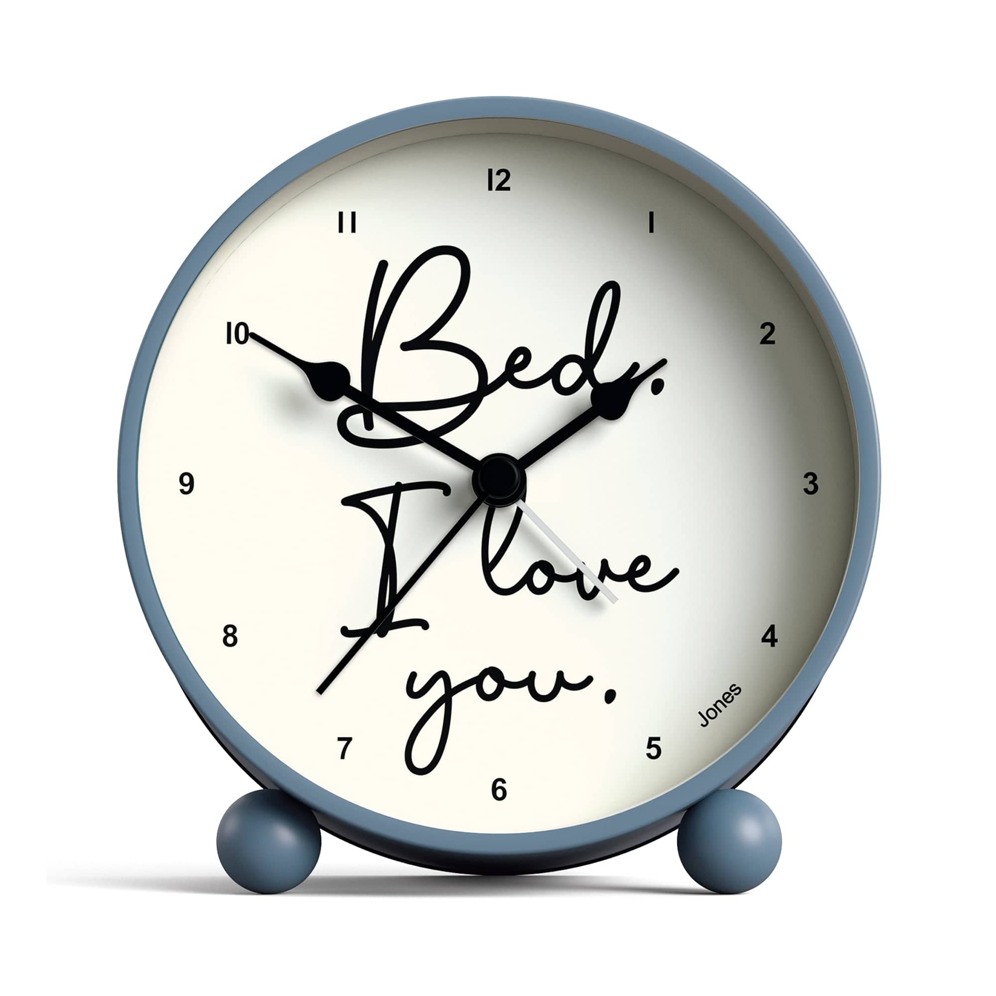 A classic yet contemporary alarm clock in blue. This decorative case holds a 'Bed, I love you' quote dial with black hands to mark time.