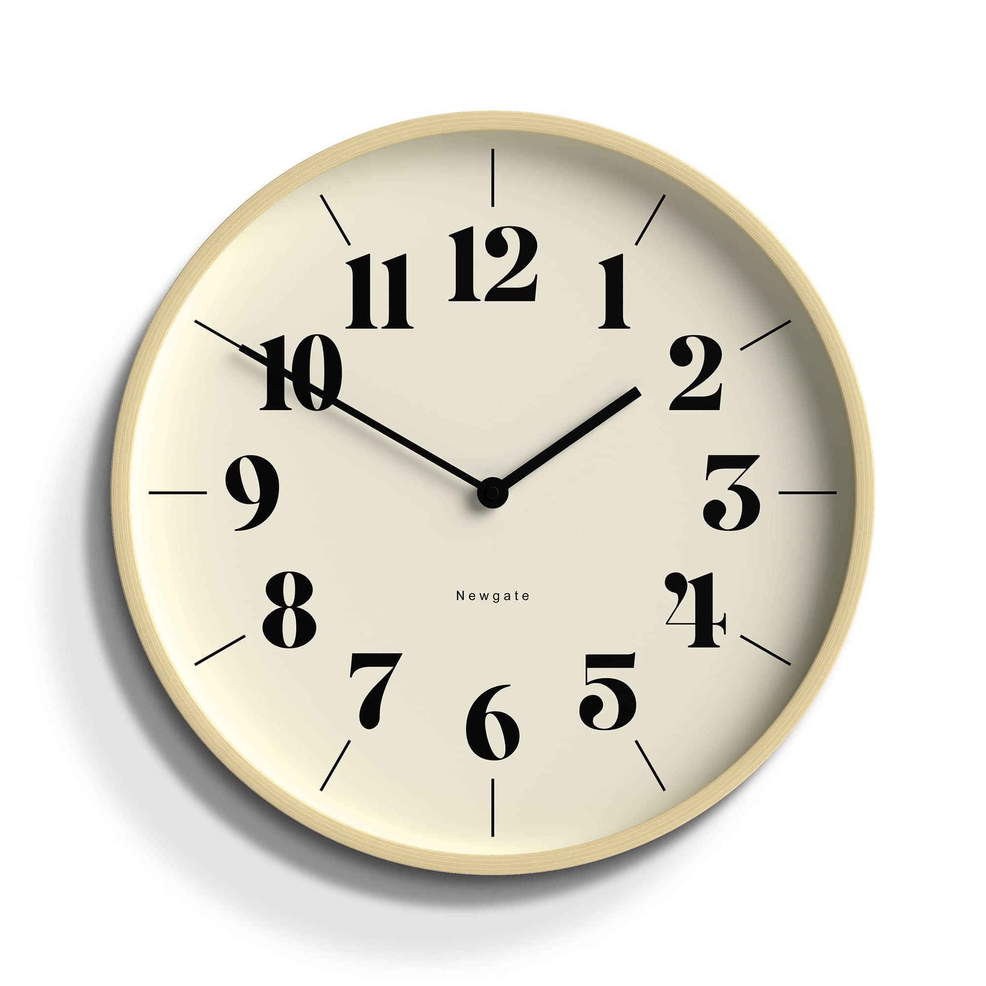 A modern wall clock with a pale plywood case and a contemporary theatre dial.