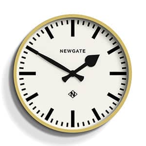 Newgate Railway Clock Yellow A bright yellow station wall clock with a bold marker dial, black spade and batton hands and a minimalist straight-cut case. A colourful wall clock is the ideal way to brighten up a room, whether that's the kitchen, living room or office.
