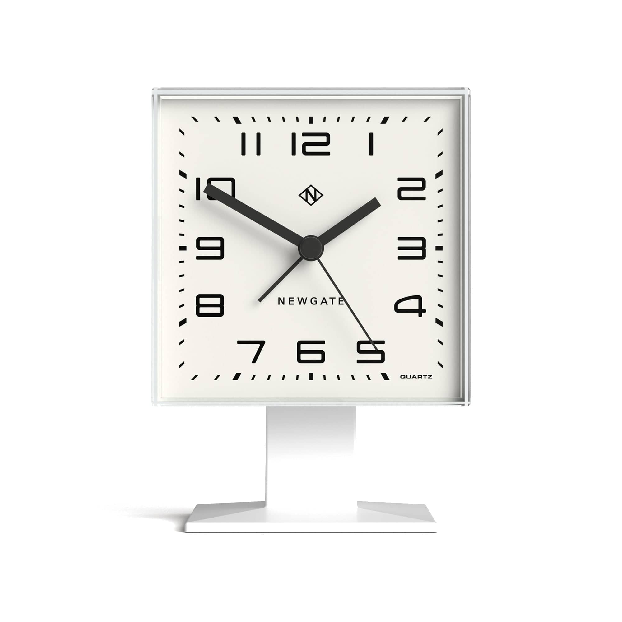 An acrylic modern retro-inspired alarm clock with an Arabic dial and deep acrylic lens. The square case has a matt finish and sits on a square podium, making this unique Newgate-designed alarm clock a great addition to your desk, shelf or bedside.