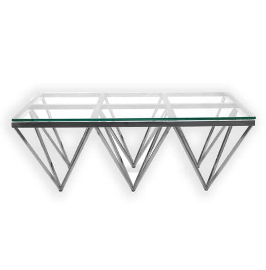 This Silver Pyramid Coffee Table is the perfect addition to any contemporary home. Made from polished steel and clear glass, it has a sleek and stylish design that will complement any decor. The pyramid-shaped base provides stability and support, while the clear glass top offers a spacious surface for placing drinks or snacks. This table is sure to be a conversation starter and is sure to add value to your home.