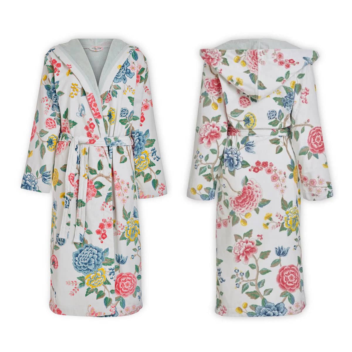 Wrap yourself with this soft and comfortable Good Evening Cotton Bath Robe White by PIP Studio and experience spa moments. The bathrobe has tie belt, side pockets and a hood. It features a stunning floral design printed in soft colour tones of white, blue, pink, brown, yellow, red, and green. It is made from high quality and soft touch 100% cotton fabric for a relaxing feel.