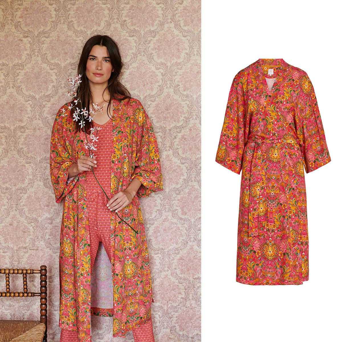 Give your wardrobe a colourful twist with our new Naomi Pippadour Pink Kimono by PIP Studio. This kimono is made of 100% viscose for an all-day comfort. Featuring a beautiful print in which you will find elegance. The Pippadour design consists of multiple sizes flowers, branches and berries on a green background. Hidden between the flowers a hare or parakeet is peeking. This comfortable Pippadour kimono features a printed tie belt closure. Mix this kimono with one of our sleeveless tops or trousers for a beautiful look. Features tie belt closure. Printed in blue, teal, pink, brown, natural, green, red, yellow, orange, and purple colour tones.