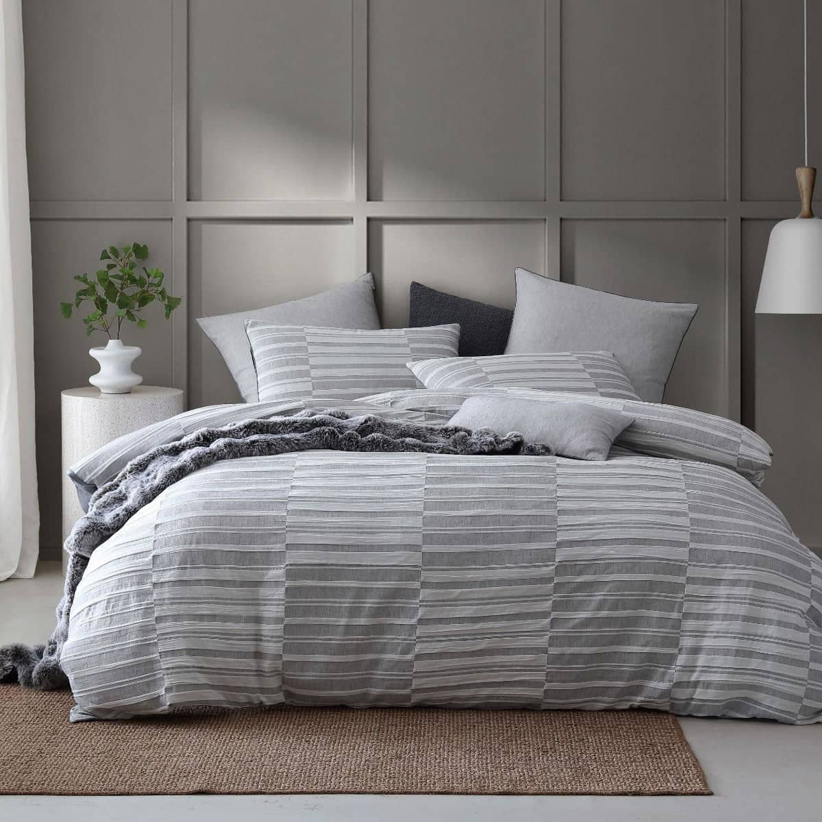 Enhancing the modest check with textures and stripes. Balmoral Ash 100% Cotton Quilt Cover Set by Platinum Collection combines woven techniques of plain weave and seersucker to create a dramatic design. The oversized scale will become a focal point within your bedroom. The simple coordinating fabric highlights the woven plain weave, paired with a piped edge makes for a curated collection. Enhance the look with coordinating accessories at extra cost.