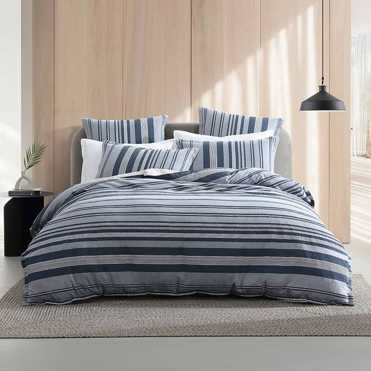 Hunter Indigo 100% Cotton Seersucker Quilt Cover Set by Platinum Collection, a classic stripe, with a modern twist. Hunter's subtle seersucker texture will add small accents of detail to your bedroom interior this season. The striking indigo and grey pair famously with the bright white stripes, finished with a simple self-tailored flange, enhancing the contemporary look. Enhance the look with coordinating accessory at extra cost.