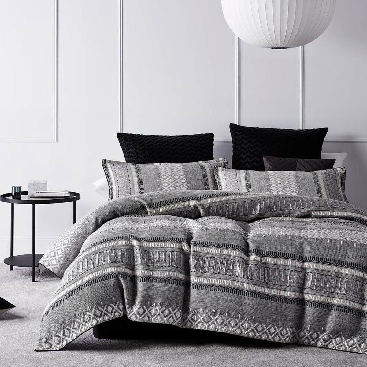 The Tribeca Steel Textured Quilt Cover Set by Platinum Collection references the decorative patterns and contours of classic architecture. A balanced composition of columns, friezes and motif repeats are woven in low relief against textured chenille. The tonal black, charcoal, silver, and grey palette is soft and soothing, punctuated with black for visual contrast and definition. Finish the look with a coordinating accessory available for an additional cost.