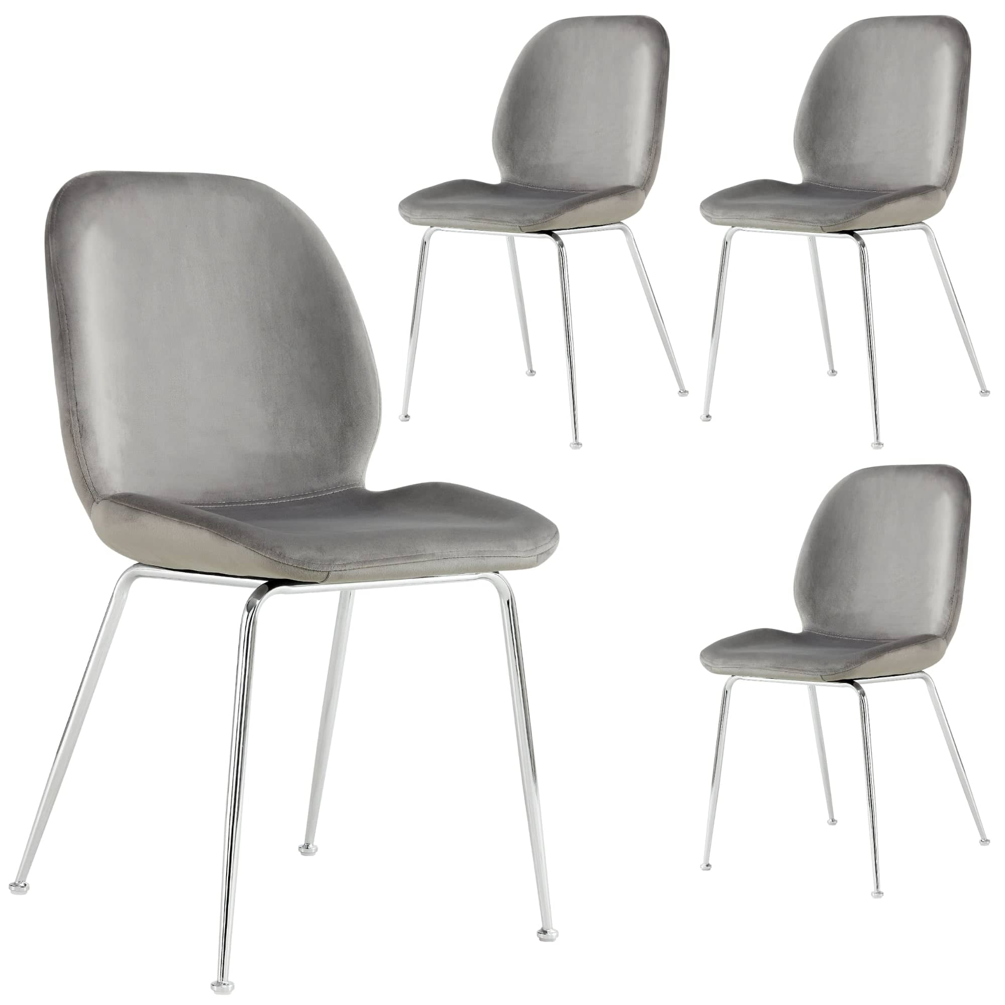 This set of 4-piece dining chairs makes your dining area look beautiful. Designed in the Scandinavian style, the chairs are upholstered in Roma velvet fabric and have strong, tapered, metal chrome legs. A soft back makes them even more comfortable, giving them a unique look. The chairs look stunning in all decor settings, thanks to their inviting shape and grey-coloured fabric upholstery. A metal frame gives them great strength. A one-year warranty is included with the fully assembled chairs.
