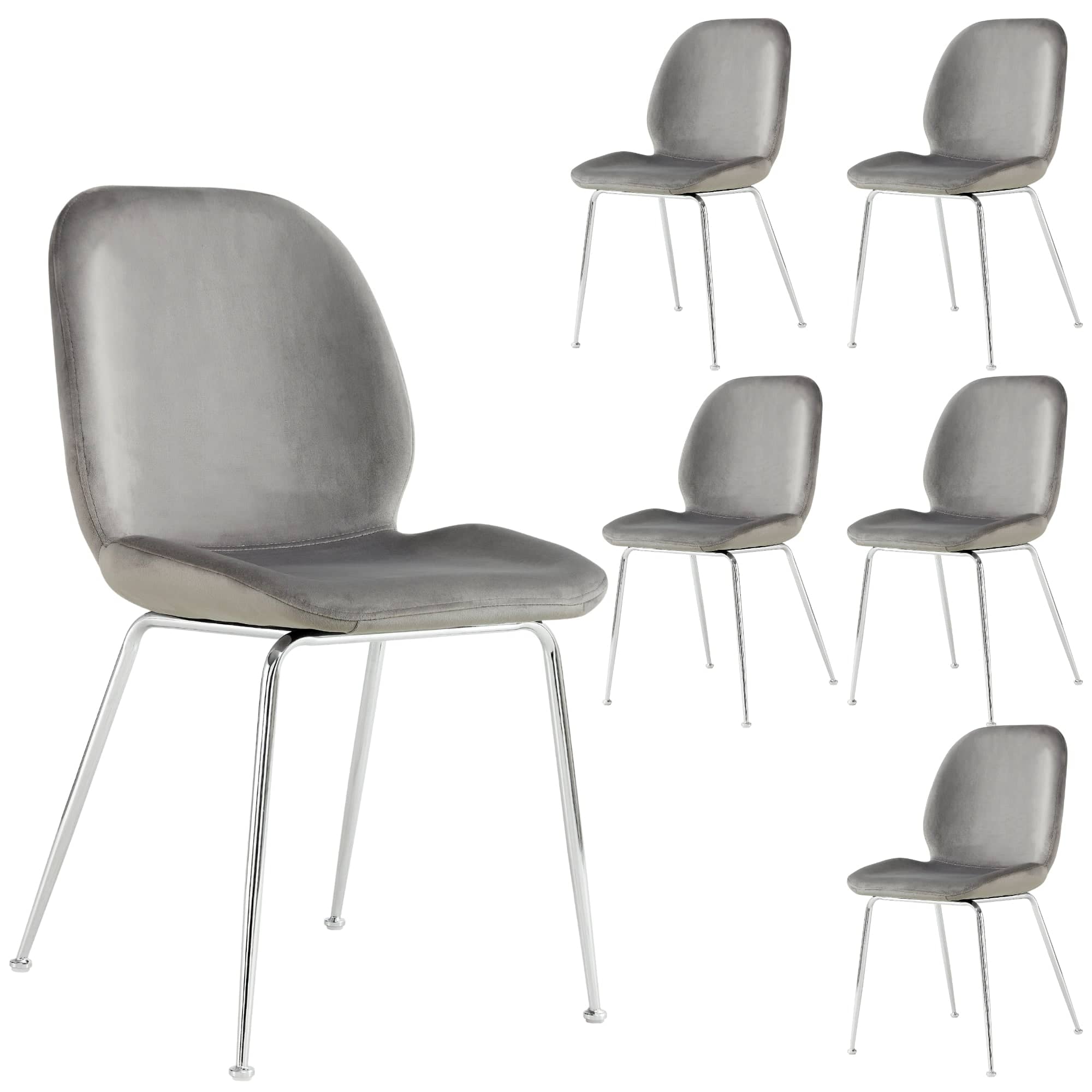 This set of 6-piece dining chairs makes your dining area look beautiful. Designed in the Scandinavian style, the chairs are upholstered in Roma velvet fabric and have strong, tapered, metal chrome legs. A soft back makes them even more comfortable, giving them a unique look. The chairs look stunning in all decor settings, thanks to their inviting shape and grey-coloured fabric upholstery. A metal frame gives them great strength. A one-year warranty is included with the fully assembled chairs.
