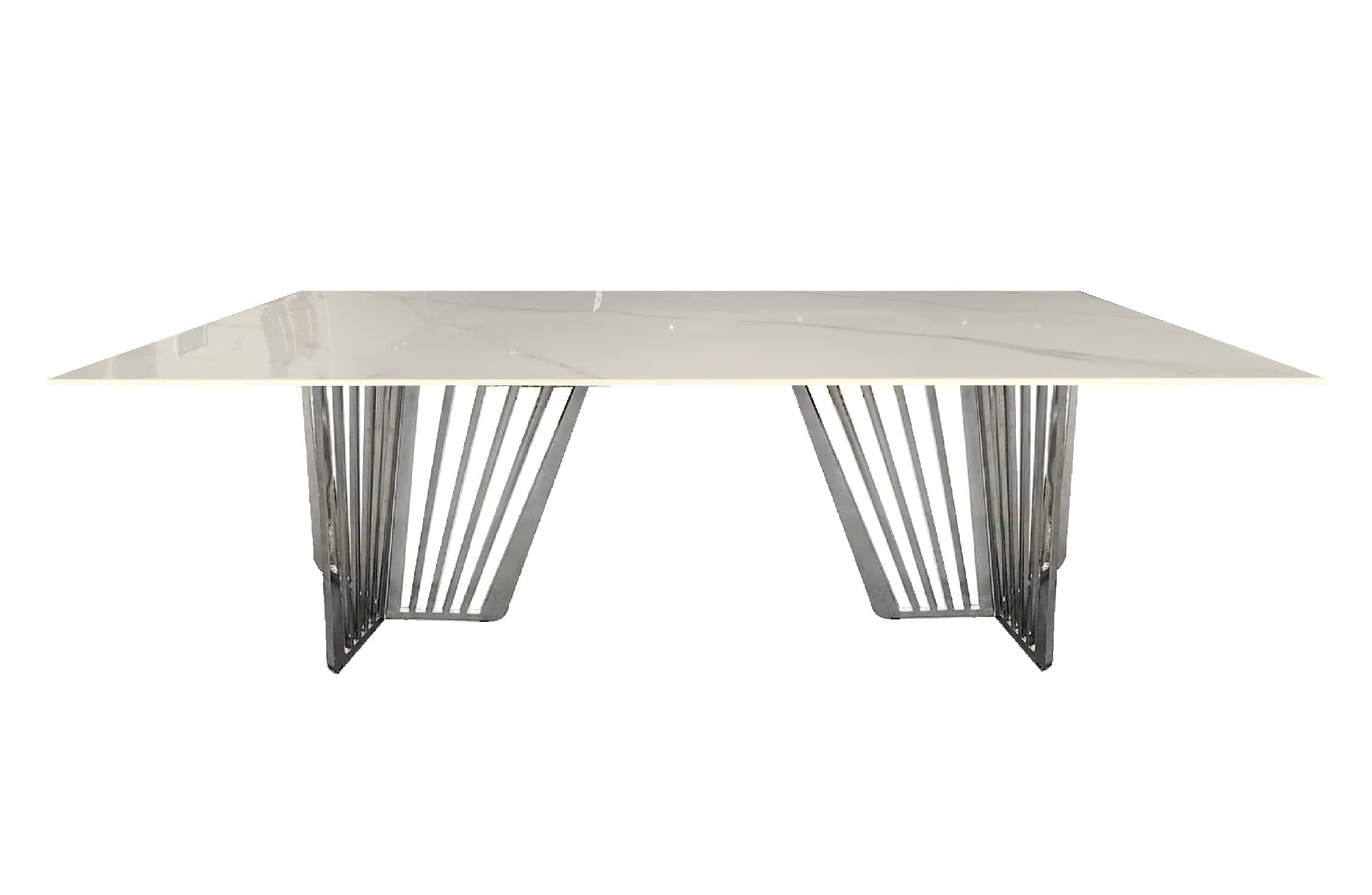 Specifications: Dimensions: 200cm x 100cm x 75cm Options Available: Polished Steel Gold with Porcelain Top  Polished Steel Silver with Porcelain Top Black Metal Legs with Porcelain Top.