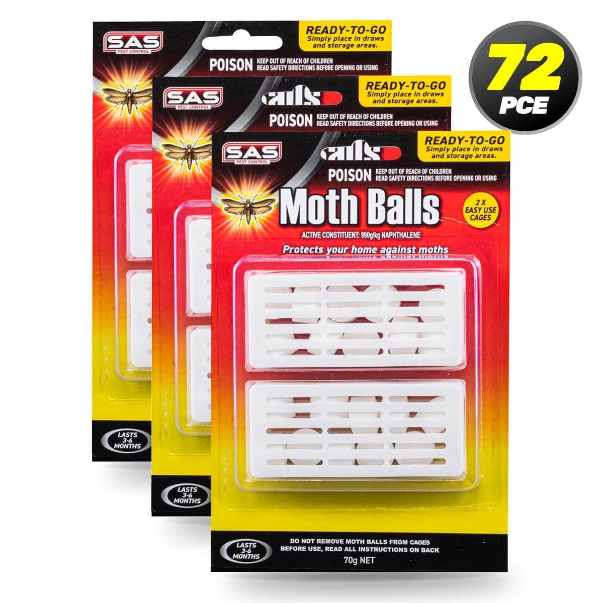 SAS Pest Control® A cost effective way of deterring moths and protecting your clothes and valuables, these mothballs are fast acting, lasting 3-6 months. Place in drawers, boxes, wardrobes and other storage areas throughout your home or business. Approved by APVMA (Australian Pesticides & Veterinary Medicines Authority). Product Features: Mothballs In Plastic Casing...
