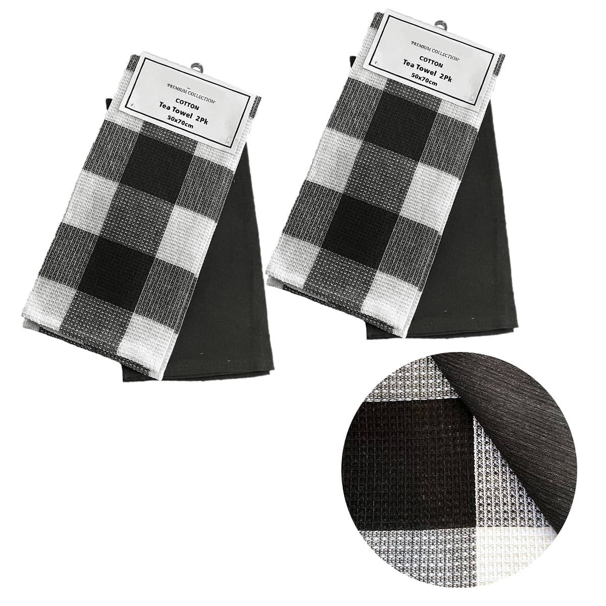 Set of 4 Cotton Waffle Checkered & Plain Dyed Tea Towels 50cm x 70cm Black