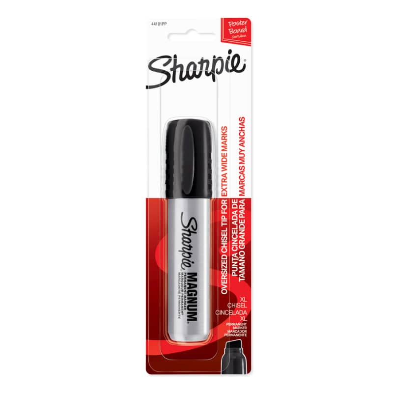 SHARPIE MAGNUM PERMANENT MARKER 44 RED BX12 WITH BOLD INK THAT WRITES ON WET AND GREASY SURFACES AND AN EXTRA-WIDE CHISEL TIP. CREATES CLEAR LINES ON PLASTIC, WOOD, STONE, FOIL, METAL, CORRUGATE AND LEATHER. TIP: CHISEL COLOR: BLACK PACK SIZE: 12