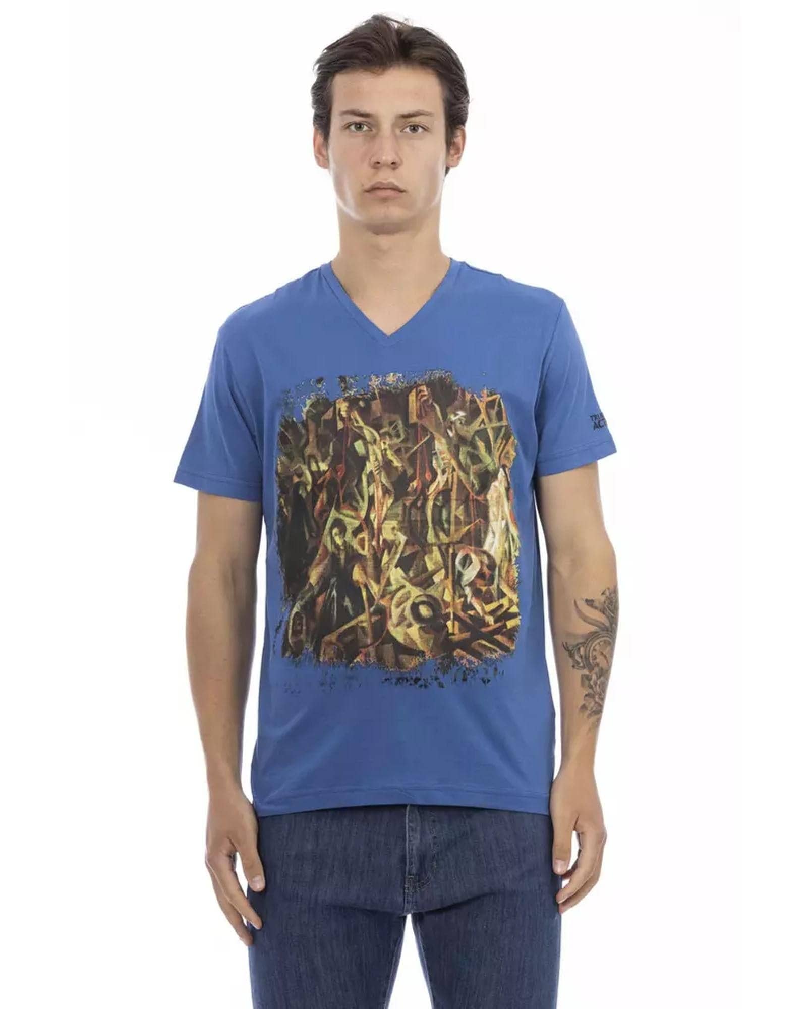 Blue Cotton T-Shirt Short Sleeve with V-neck Front Print Made for men High-quality cotton material Comfortable and stylish Suitable for casual or everyday wear
