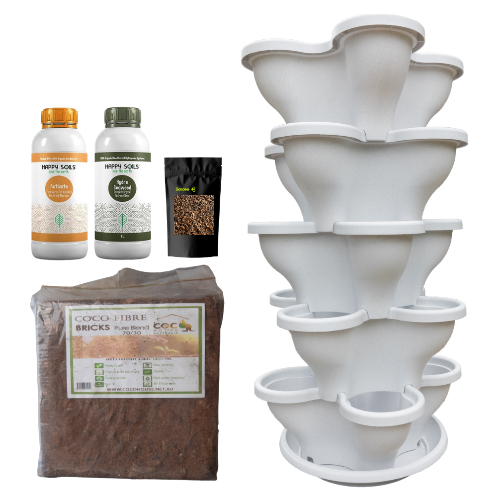 Single 5 Tier Large Verandah Planter Garden Kit (Inc Coir, A & B Nutrient and Bardee Superfly Organic Booster) - Stone White