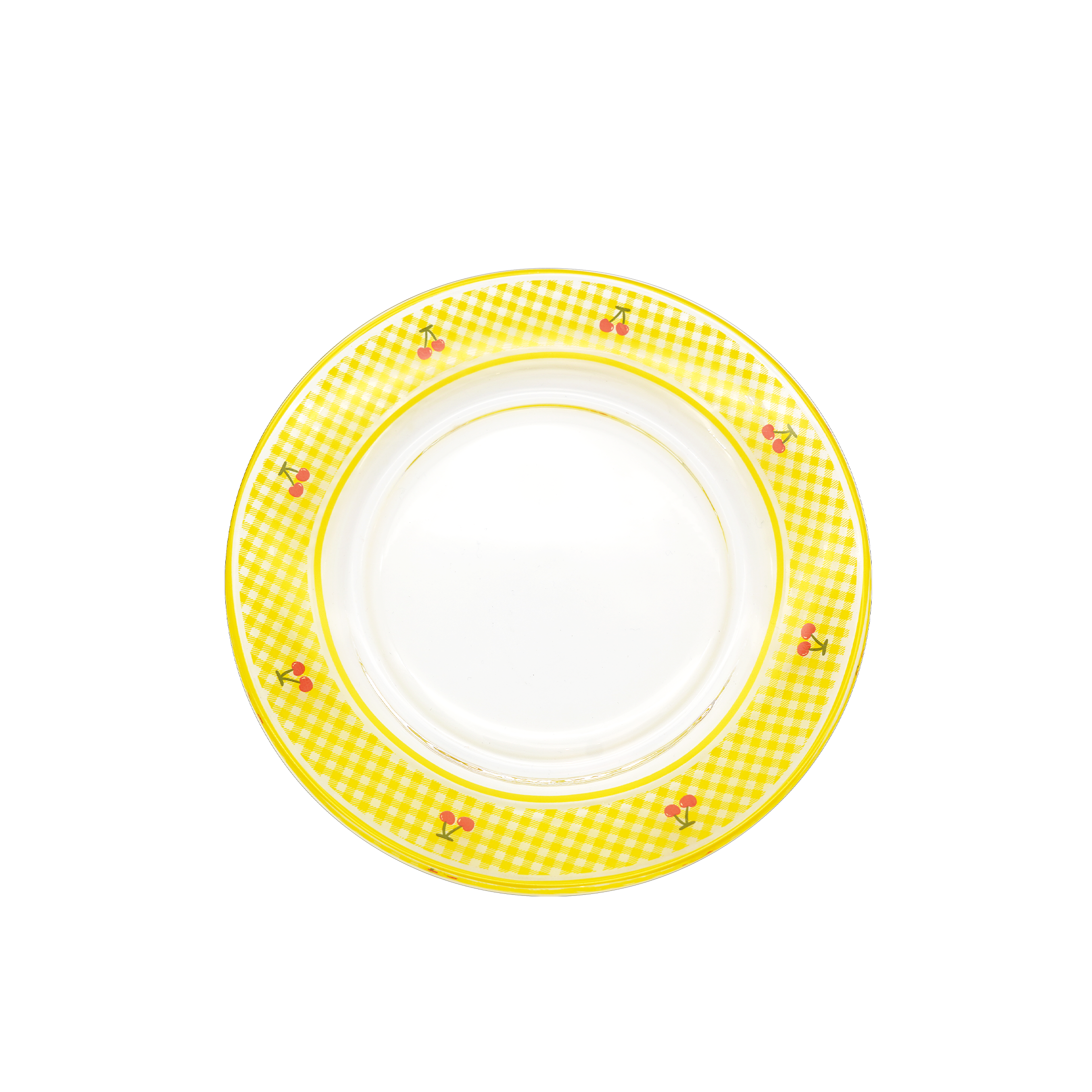 This Springs Springs Flat Plate will make a lively and colorful addition to both modern and classic decors. Handcrafted of glass, each piece is coloured in a Blue/Yellow checked trim decorated with a cherry/Daisy motif.