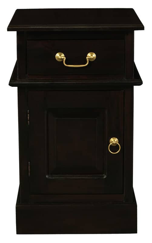 This Tasmania Bedside Table is a token of charm for any room. Its solid mahogany timber exudes a warm presence while the brass accents add a touch of romance. The single drawer and door open to reveal space that holds both dreams and necessities close to your slumber.