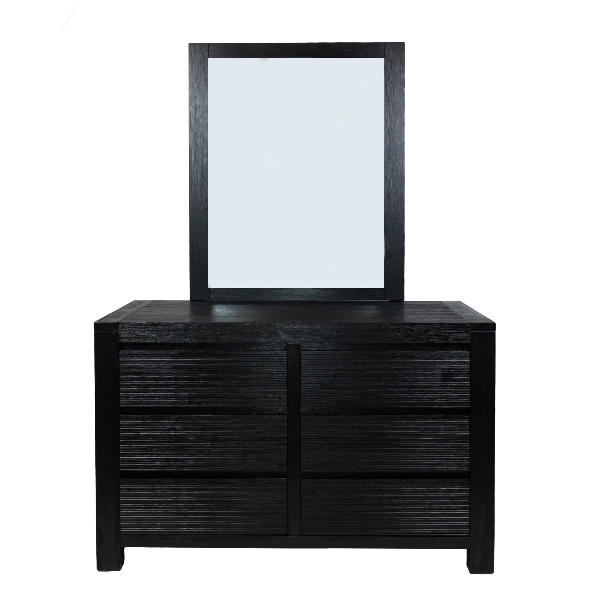 This beautiful dresser-mirror set makes a bedroom look classy. The furniture pieces are crafted in the contemporary style, which not only enhances the charm of the bedroom but also helps keep it well-organized. The dresser has 6 spacious drawers. All the drawers have full metal extension runners and integrated handles for a clean seamless profile. The annealed glass mirror with a crisp and clean wooden frame looks classy when accompanied by the dresser. A sturdy construction of solid acacia timber in brushed black finish gives the furniture pieces a beautiful shine. The whole furniture collection is made of sustainably harvested wood. The dresser-mirror set’s black finish goes well with a variety of interior decor styles, and a one-year warranty is included with them. Both are fully assembled.