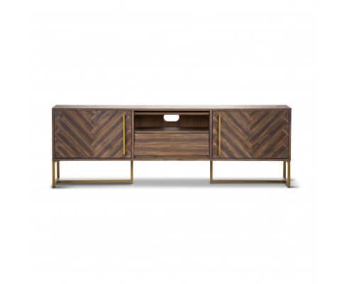 A well-designed TV unit brings life to your living room. This TV unit, beautifully designed in modern style, will add a vibrant touch to your living space. It has 2 doors with metal handles, covering sizable compartments; 1 niche with a shutter and a cable hole; and 1 drawer with full-extension metal runners.The TV unit exudes an exceptional look as it is made of sustainably harvested Solid and veneered Acacia timber with a herringbone pattern parquet, showcasing a beautiful wood pattern.The TV unit features the natural appeal of the Acacia grain.Metal legs and handles with a durable powder coat finish further add to its good looks. A Tesky finish makes it shine in any decor style. A one-year warranty is included with this easy-to-assemble TV unit.