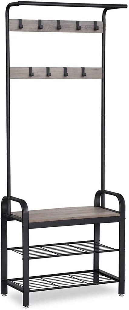 This hat and coat stand not only has 9 sturdy hooks and a clothes rail at the top, but it also offers two metal wire shelves for shoes and a sturdy bench that you can comfortably sit on while you put them on - Don't Dread The Assembly: