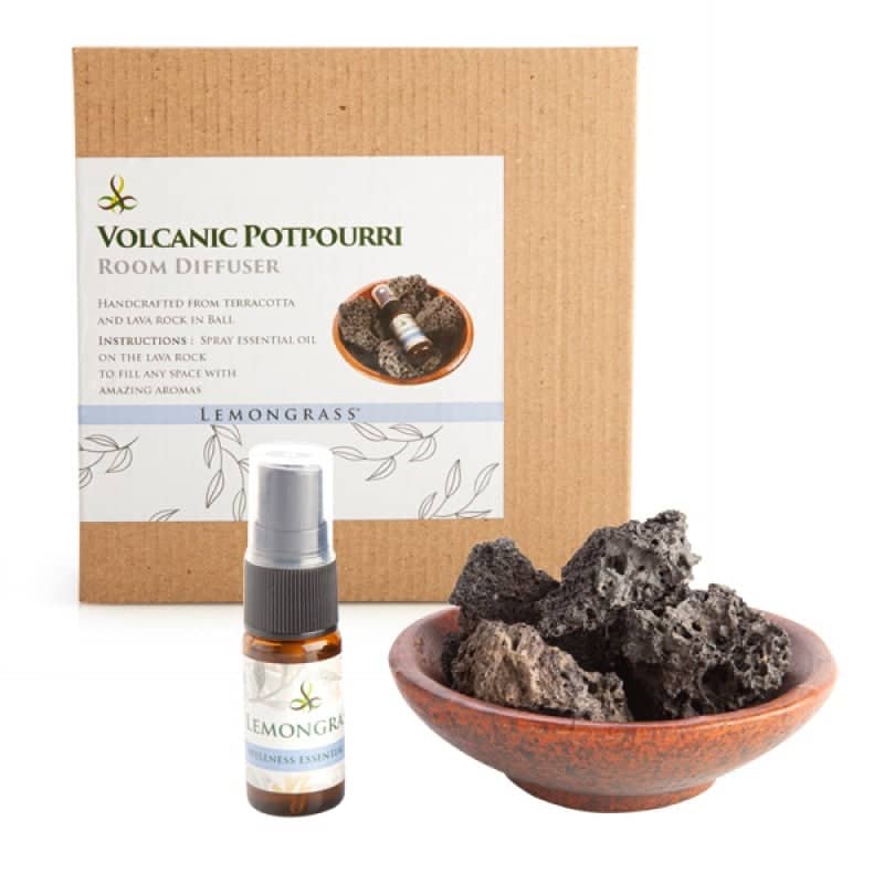 Includes terracotta bowl, volcanic stones, black drawstring bag & lemongrass essential oil