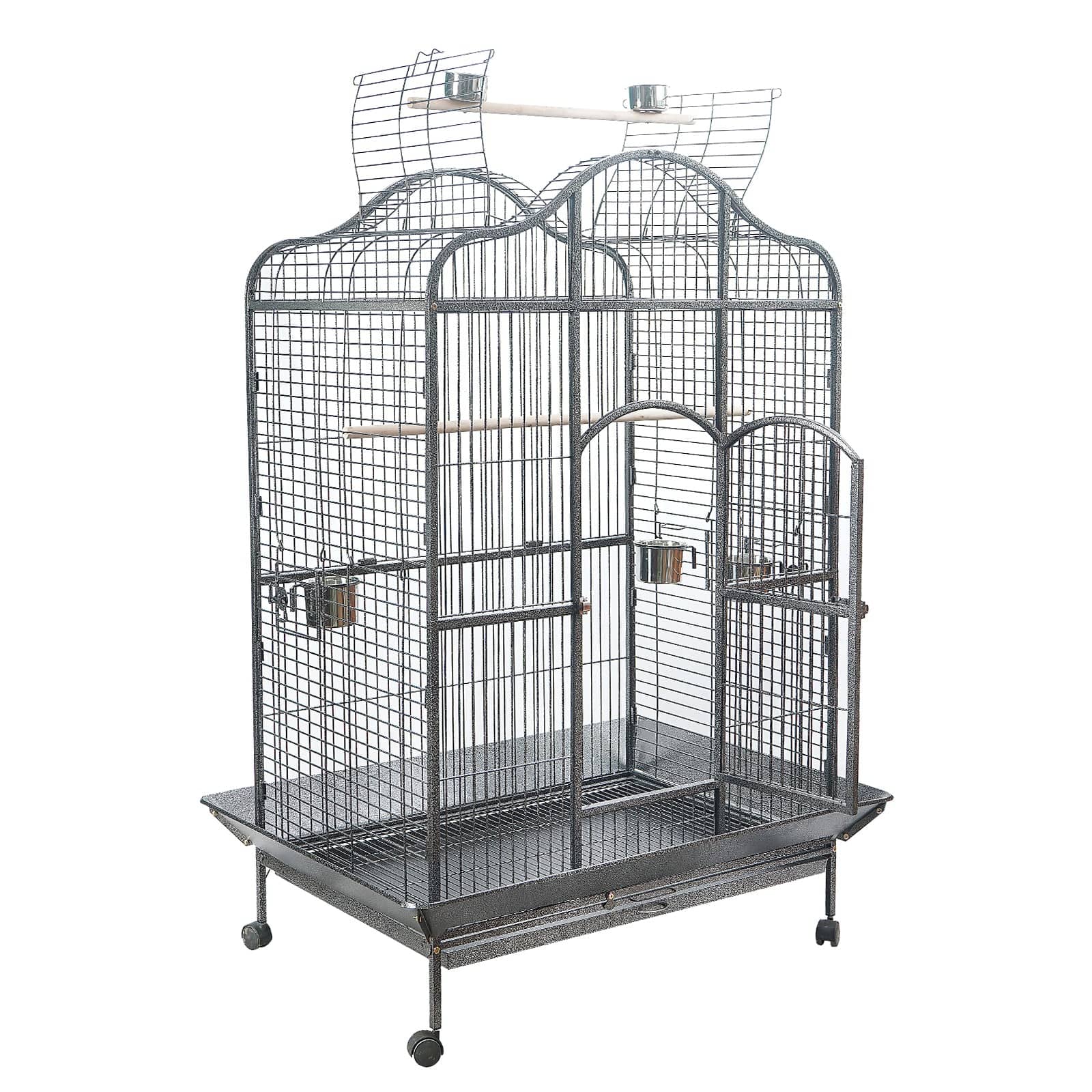 The birdcage is made of heavy-duty wrought Iron with a vein powder coated frame so it is tough and durable. The dimension of this cage is perfect for medium and large size birds and parrots. You can convert the cage to an open roof easily and let your bird perch up high. This brand new Open Top bird cage comes with seed skirts all around the cage, a large access door, side small access windows for stainless steel food/ water trays, 2 timber perches (one with 2 stainless steel feeders for the open roof), and removable tray for easy cleanup. The castor wheels are equipped on the matching stand provides great mobility.
